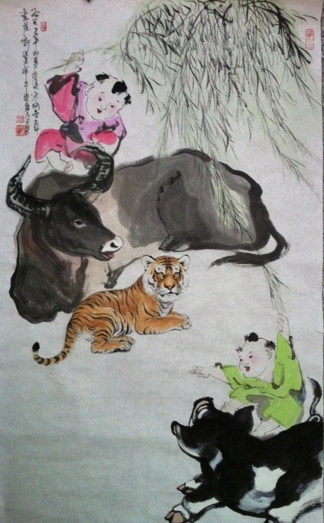 更为让人啧啧称奇的是这幅家庭生肖画,是由海上著名画家刘汇茗、宗炳春两人携手共同完成的。画家刘汇茗擅长于“情”,而画家宗炳春又专业与“虎”,故此,两人携手共创了这幅满园春色、意蕴深远、和谐生动,集“思”从“枝”上生、画“笑”从“心”里发于一体的家庭生肖《喜气洋洋》图,而其中的他们用画上柔弱的枝条、嬉闹的稚子,父母的厚爱来装点的,不正是我们这个时代人间之美,我们这个社会的家庭之梦吗?我看是。