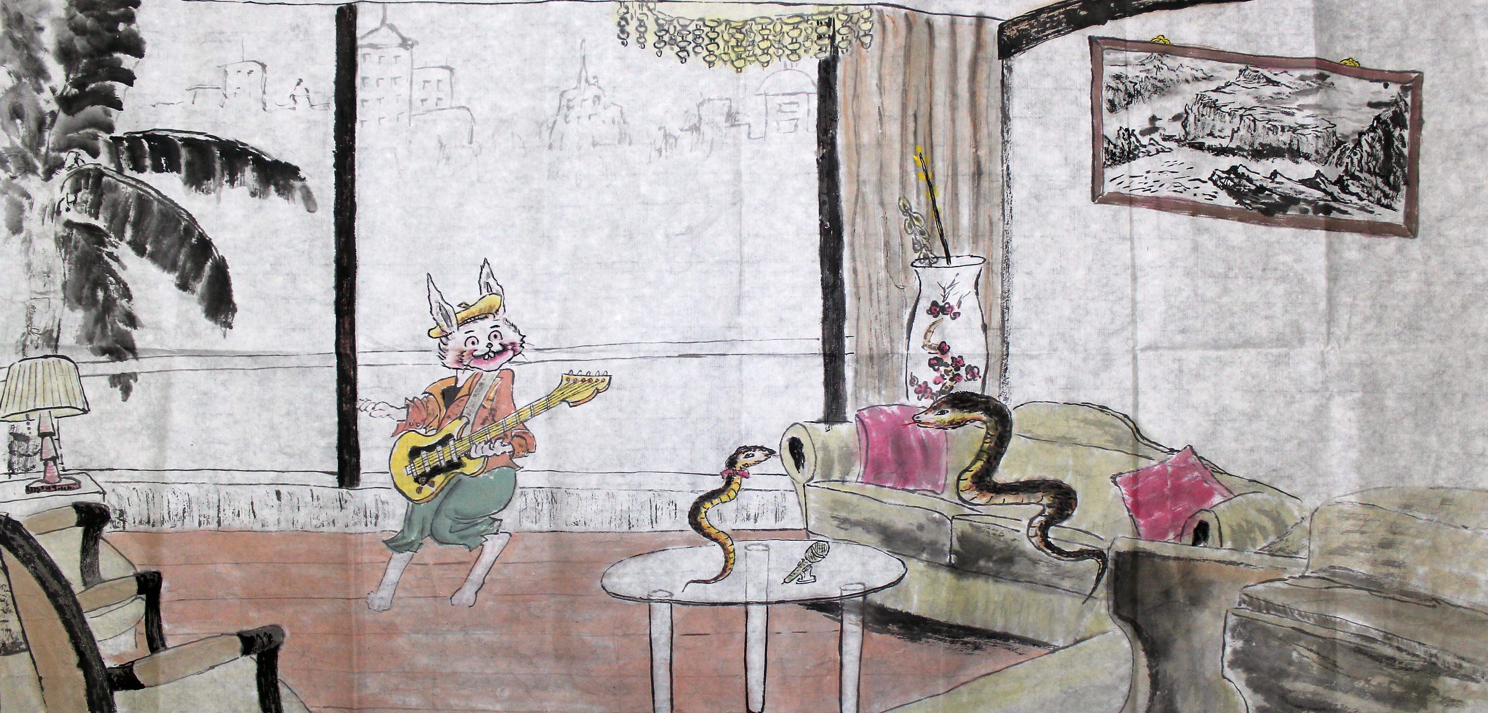 这是一幅家庭生肖画,爸爸属蛇叫张辉,妈妈属兔叫倪莉华,女儿属蛇叫倪慕菡。从图中我们可以看出2条可爱的蛇正在尽情地歌舞,美丽的兔子正欢乐地弹着琴,其乐融融。人生在世,财富、权利、容貌……貌似成了我们人生追求的全部,我们渴望站在财富及权利的最高点居高临下,也许我们误认为这就是幸福的人生。然而当我们过分追求这些东西时,当我们拥有了权利和财富时,当我们站在成功的顶楼时,我们却成了真正的孤家寡人,亲情、友情、爱情等等都离我们而去,留下的只是虚伪的奉承和祝福。我们有没有想过这一切到底是为什么?难道这就是我们想要的结局?其实幸福很简单,就是一家人快快乐乐在一起,平平安安过一生,所谓家庭和谐当如是。有时候不要把利益看得太重,那会让我们失去很多。