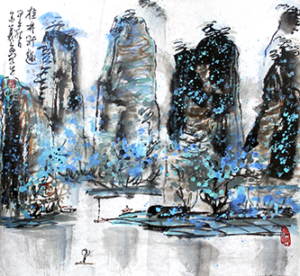 “金氏漓江山水”以传统六法论为基础,又融合西画语汇和现代设计元素,呈现出令人耳目一新的漓江意韵。《桂林野趣》就是其代表之作,画中点、线、面的西化设计和传统笔墨的乱、踩、皴相得益彰,拔地而起的几座大峰都采用等腰三角形构图,色彩辅以光学原理衬托,营造出疏淡迷朦又稳如泰山的画面效果。山不似山,水不似水,却山水天成,妙趣画外。山脚的小船更是添笔的恰到好处,优哉游哉将你引入“轻舟已过万重山”的审美之境。8岁就师从国画大师应野平,后又得名教授孟光、姚有信、张英洪、苏春生等点拨的金义安如今妙绘漓江自成一家,其融东贯西掺杂海味的漓江山水神韵独到,充盈着浓郁的时代气息,在笔会与画展中收藏价值不断攀升。