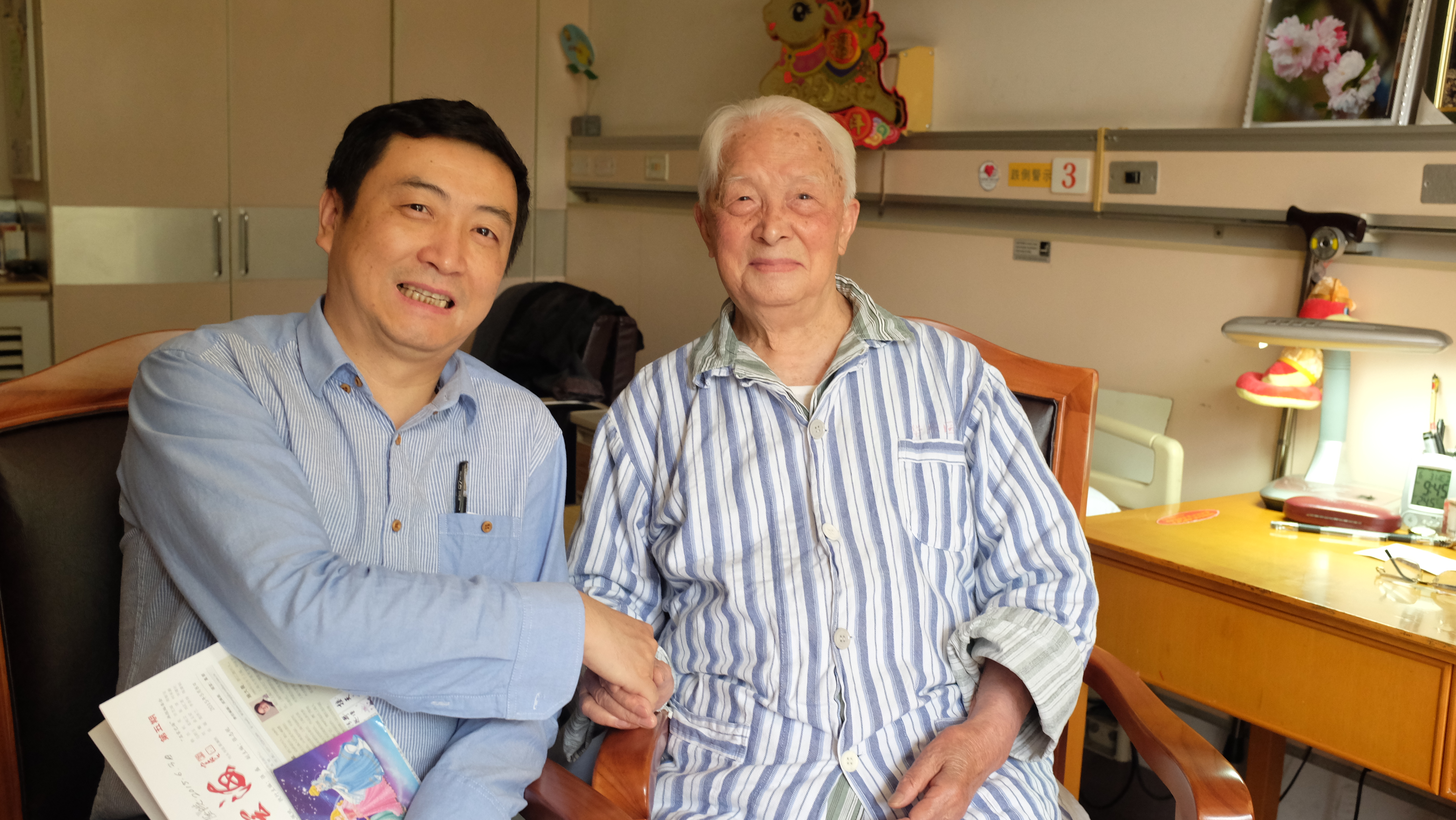 每逢佳节倍思亲。在快过年的前夕,最让年轻的施平惦念的人是与他同名的105岁寿星老施平了。他还好吗?现在过的怎么样?身体健康吗?老施平是一位德高望重的革命老前辈,曾担任华东师范大学党委书记等。五十多岁的小施平也是共产党员。在华东师范大学一所楼里创办“海上画家艺术网”,又任《名家艺海画报》总编,是上海著名艺术策展人。他听说了老施平的故事后非常仰慕,萌生了想见见老施平的愿望。华东师大教授包汉中、李天任、汪祥云等知道了施平的愿望,便积极引见,促成了一段缘分。