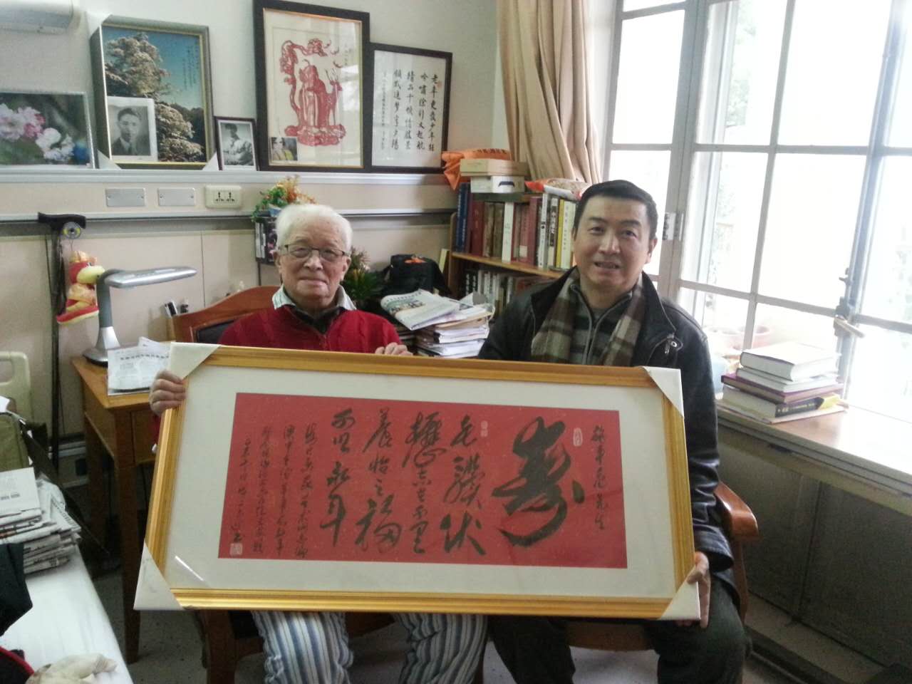 此情别来情绵长。小施平分别后总是忘不了老施平。为了表达对老施平的敬重之意,传递新年祝福,他见过病房里挂的书法作品,考虑再三,特请了《海派书画百强经典》一书中“毛体”书法家张玉迎,用红宣纸写一个大大的“寿”字,并择句题写:“老骥伏枥,志在千里,养怡之福,可得永年”,并将书法装成镜框,它代表《海上画家艺术网》全体同仁和一百位书画家心愿,祝老人家健康长寿!老施平看到寿字十分高兴,两人端着镜框合影留念,用老施平的相机拍摄。在“咔嘹”声中,彼此都感受到了志同道台的真正欢愉。老施平还几番手持相机查看,生怕会漏拍了。