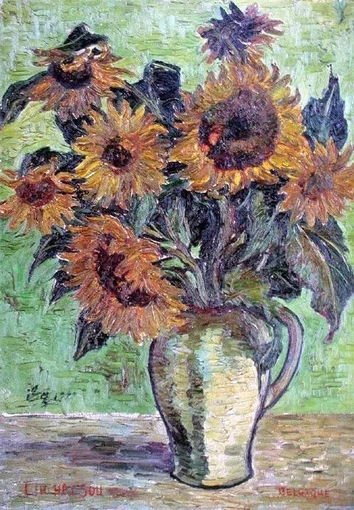 《前门》是刘海粟在1922年到北京拜访蔡元培先生时的一幅写实作品,它的色彩、造型都传承了写实派的风格,从中也可以看到后期印象派的一些影子;《向日葵》的色彩和笔触和梵高的《向日葵》非常接近。他的早期作品颇受西方印象派影响,这也和他在国内没有受过严格的油画创作训练有关。
