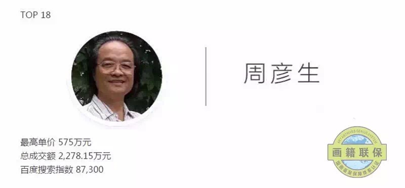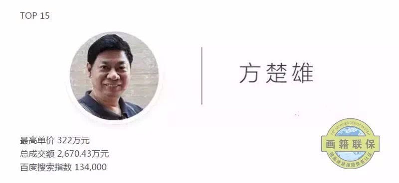 数据来源于样本拍卖公司网站及雅昌艺术网,本榜单成交数据样本公司为:佳士得(香港、纽约、上海)、苏富比(纽约、香港、北京)、保利拍卖(北京、香港、澳门、厦门、济南)、中国嘉德(北京、香港)、匡时、北京荣宝、北京宝瑞盈、北京翰海、华辰(北京、厦门)、上海明轩、朵云轩、上海天衡、上海嘉禾、上海泓盛、上海驰翰、荣宝斋(上海)、浙江南北、西泠、荣宝斋(济南)、广东崇正、华艺国际、罗芙奥。