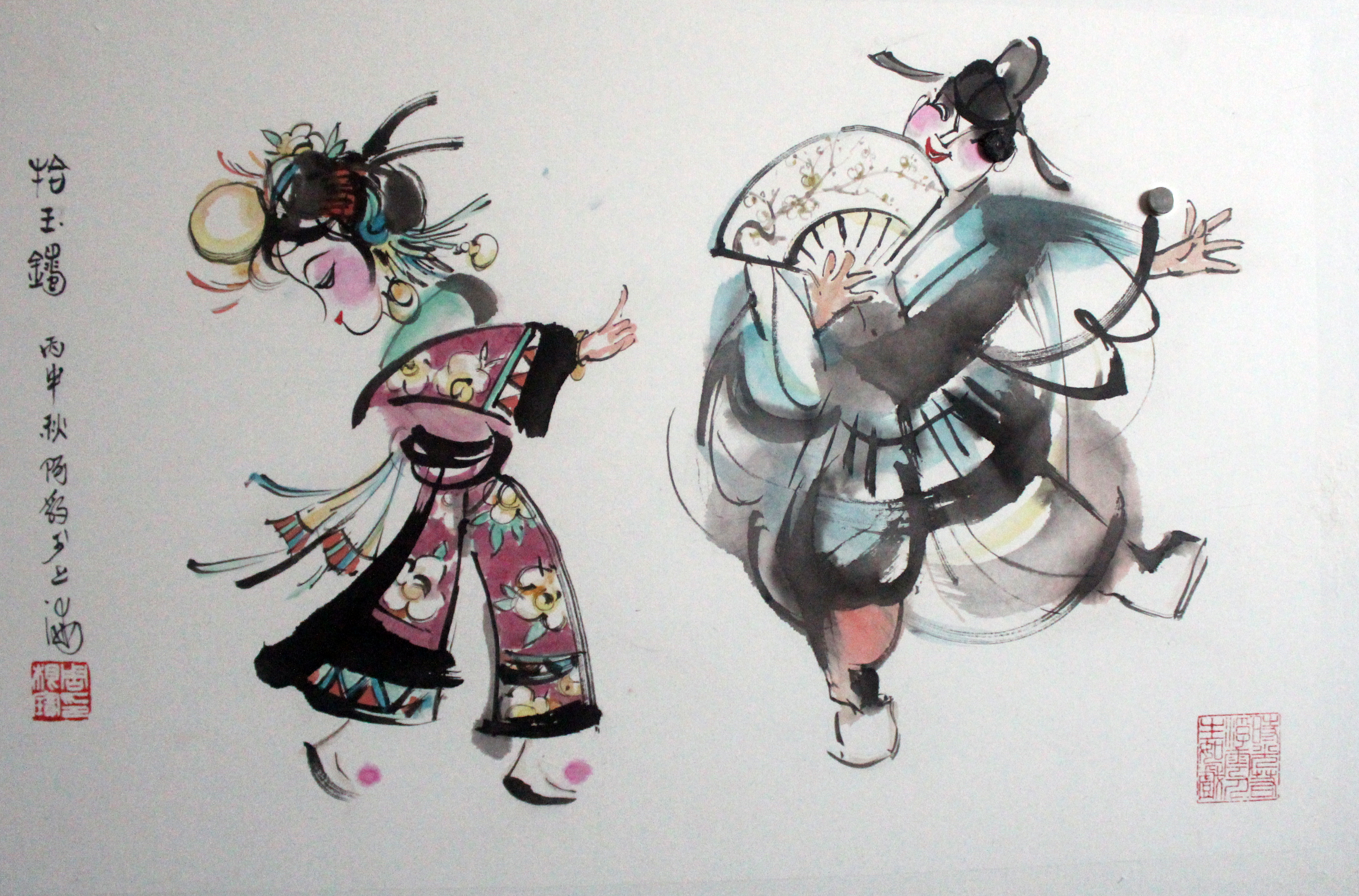 旅美画家周根宝,师从谢之光、方增先、程十发等大家,在众家画风的融合中创新绘画风格。上个世纪80年代接触戏曲人物画后,创作硕果累累,90年代旅美经历中,又糅合西方画技,将戏曲人物画赋予生命,打造戏曲张力。此次展出的《借扇》,运用动感的弧线及枯笔等表现出孙悟空的机灵与调皮,又用写实的技法将铁扇公主美态从服饰、帽子、装饰中衬托出来。在周根宝的眼中,这就是一出喜剧,虚实结合,浓淡相结,将武斗的场面展示的惟妙惟肖。