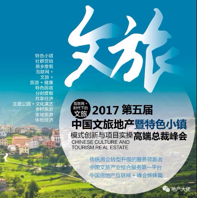 【平台推荐】2017年1月8日—9日将在北京召开中国文旅地产暨特色小镇模式创新与项目实操总裁峰会,集合20多位行业大咖和一线操盘手亲自为您全方位解读互联网+时代的文旅地产如何赢在内容、如何打造有价值的极致体验,与参会嘉宾共同践行20几个项目的创新商业模式和运营模式。