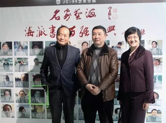 海派百强名家齐铁偕、著名策展人施平、齐铁偕夫人百强展板前合影