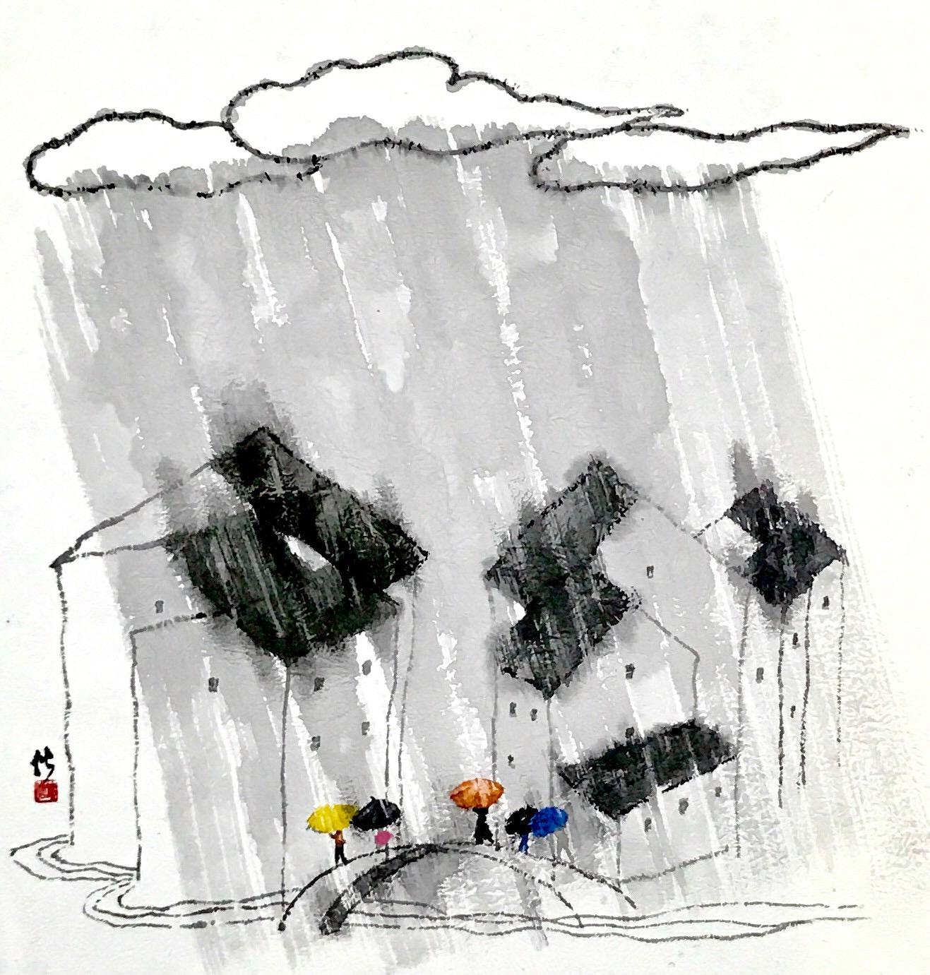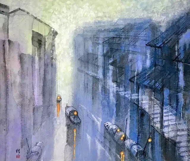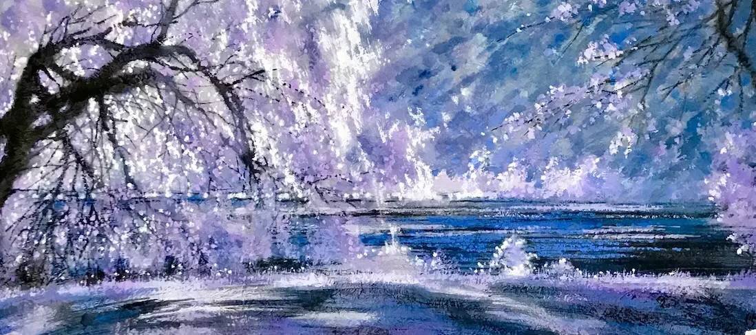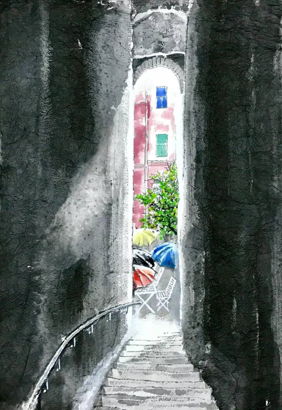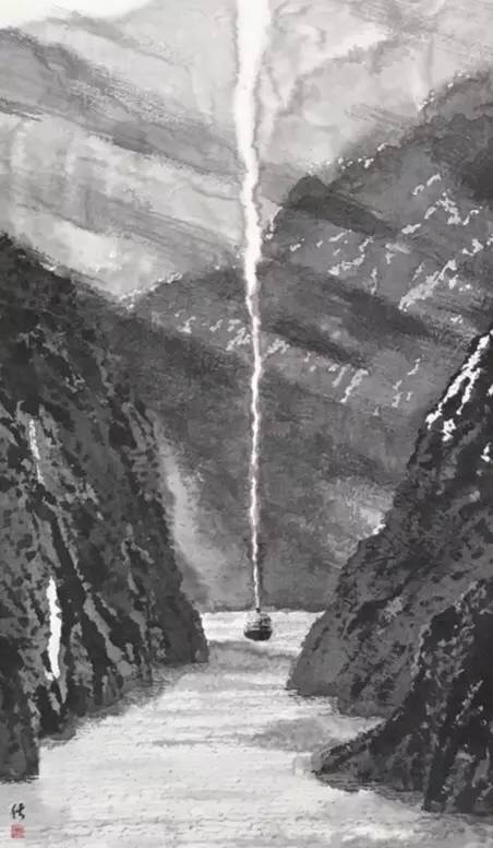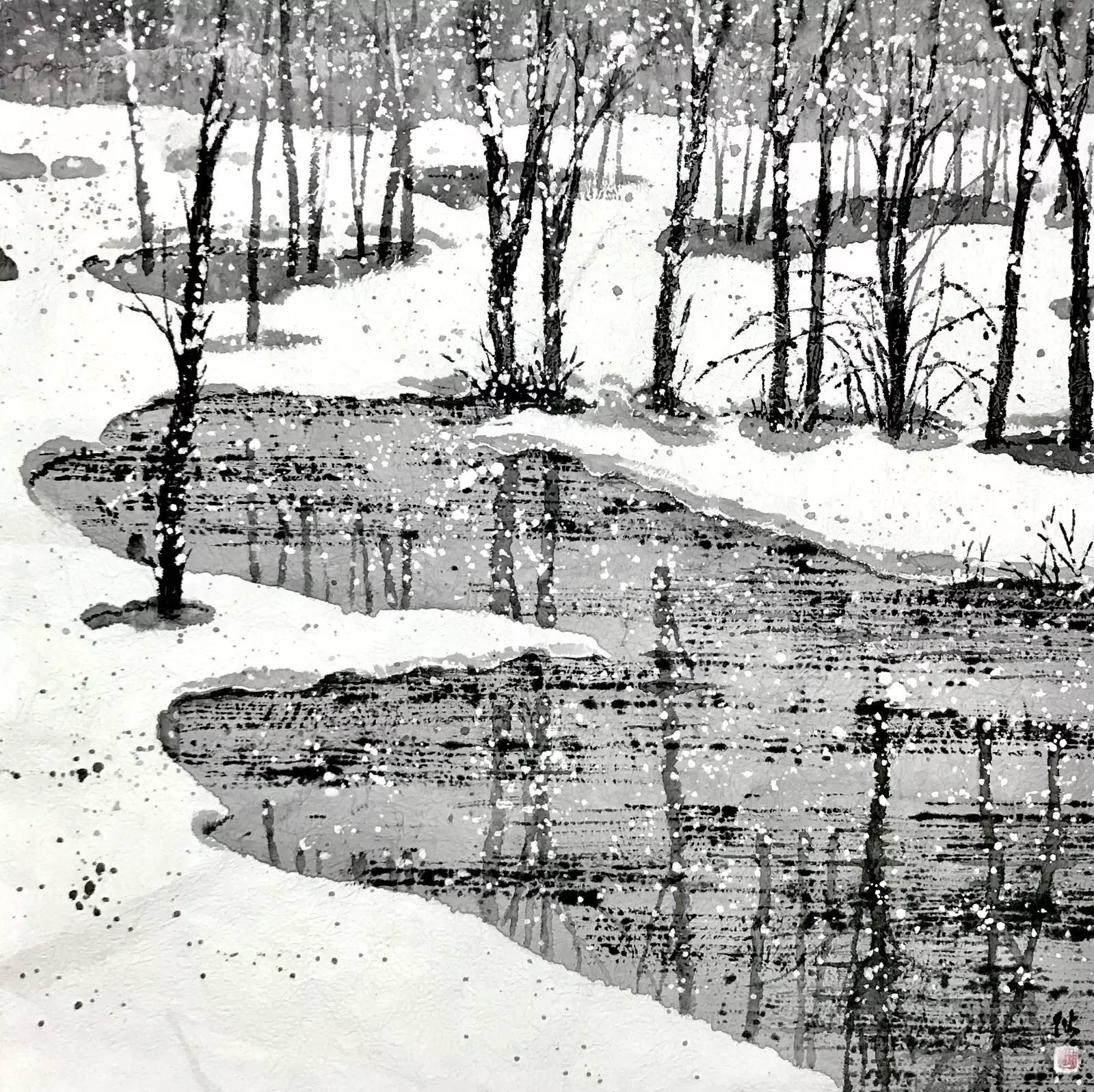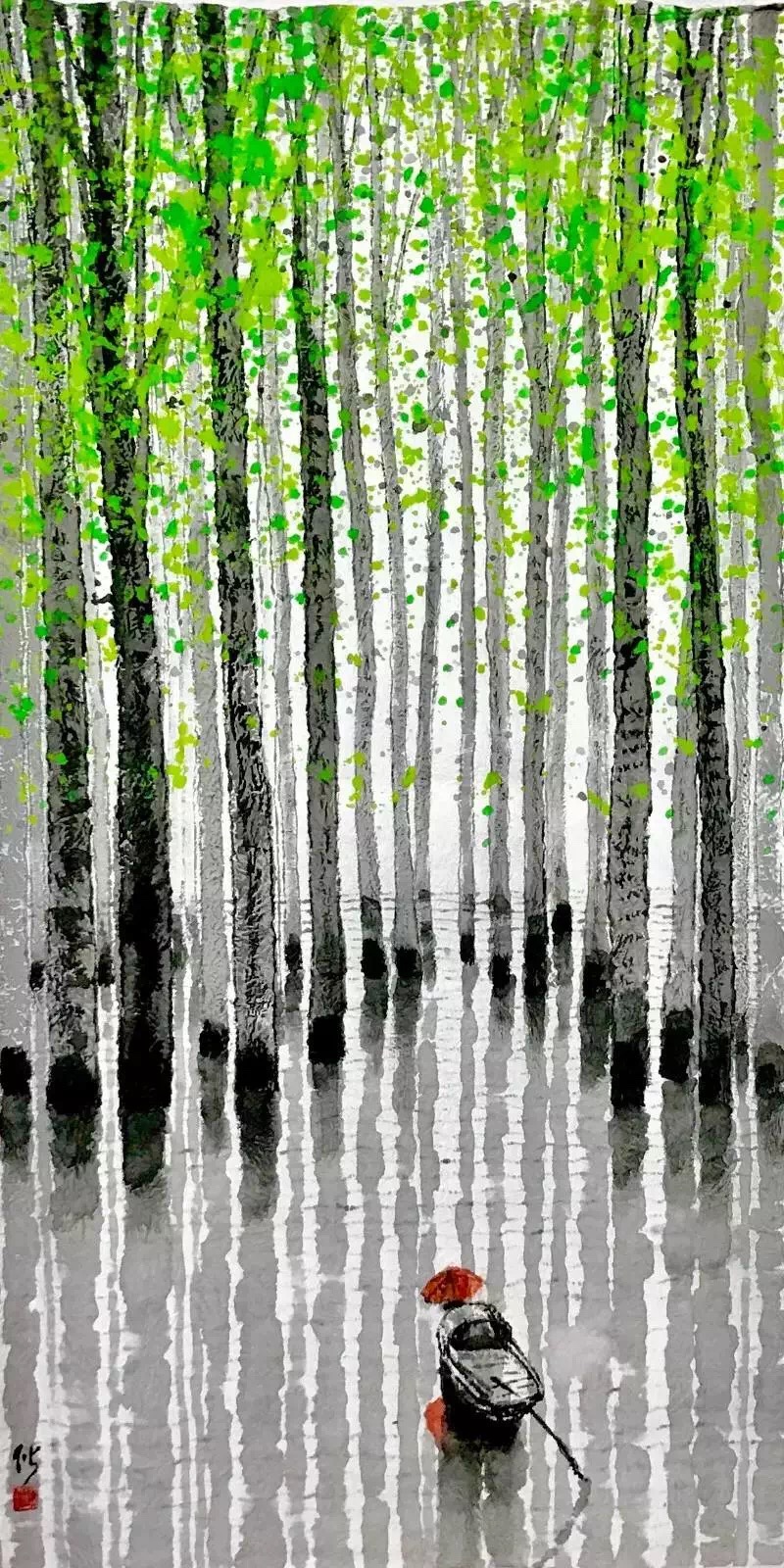 齐铁偕的现代水墨画追求大胆创新。大自然千变万化,艺术创造也应万变千化。他笔下的彩墨画,打破艺术的疆界,用画来表现诗,用诗来酝酿画,最后再用书法来画龙点睛,堪称一绝。他常言道,“我想让诗、书、画三者融会贯通,把流动的时间凝聚在一幅画里,再把这种感动留给观众”。这种感动,既有水墨画的别致韵味,又巧妙地将印象派的风格融入中国画,糅合西画的光、色、影,运用中国的平远、高远、深远法,这些具有现代油画般的厚重质感和形式感的水墨画,具有很强的视觉冲击力,呈现出的是一幅幅能够“呼吸”的鲜活作品。