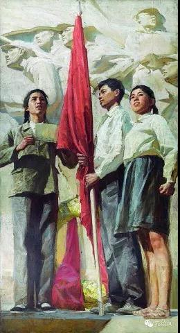 那个时候流行红光亮主题的画,但陈逸飞画的风格和红光亮风格是不一样的。陈逸飞画的是两联油画,属于姐妹篇,其中一篇(《红旗2》)被中华艺术宫所收藏(备注:后经上海油雕院执行院长肖谷补正:《红旗2》被上海油画雕塑院收藏)。但就这个革命题材的《红旗》也被批判了,批判陈逸飞的创作像苏联题材(见作品1)的绘画风格,当时批判《红旗》系列是宣扬修正主义的战争恐怖论。