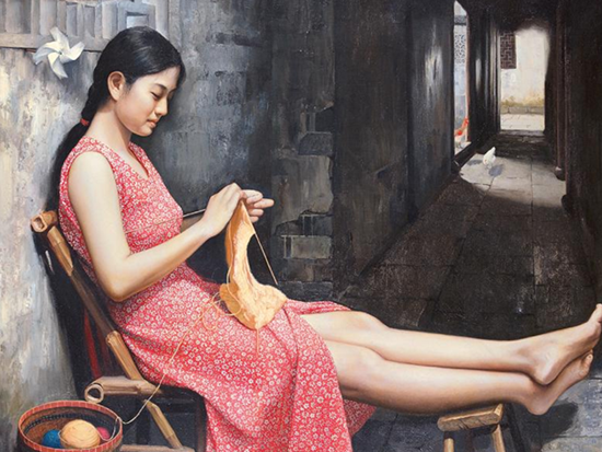 何老师善于用现实主义的表现手法来描述生活中的一个个小的片段和场景,反映的是人们最自然、最生动、最真实的生活。就像他的《老井》系列,其中有一个站在画面最前端的小男孩,当初按照作品需要摆动作时,总是达不到让人满意的效果,反而是他自己玩耍时那个最自然的动作打动了画家,并将这样的状态定格在了画面上。就这样,为了追求画面的完美效果,何绍教家里有着许多大而厚的像册,他可以为了一个雨中的背影,拿着相机,足足拍了一大册各种背影的照片。这样塌实、丰富的前期准备工作使他的创作更加细致真实,更加能够打动人心,也更加能够引起共鸣。