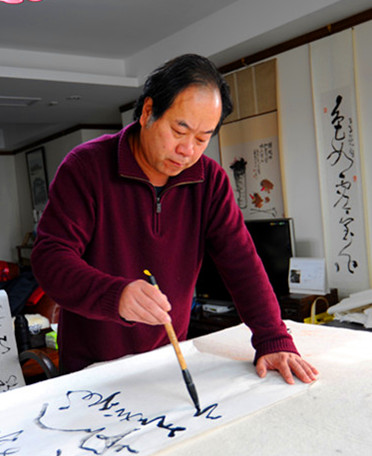 丁申阳,中国书协会员,上海书协副主席,上海青联副秘书长,中国书法家协会草书专业委员会委员,上海电影制片厂美术师。在这次为期三天的“海上画坛、情系徐汇”的大型画展和笔会中,尽管丁老师的名字被写在红纸上,放在了贵宾室宽大的主席台上,但是,每当有人慕名远来,询问丁老师今天来不来的时候,我们的工作人员总是用:“大概会吧、在等等看吧”的话来答复观众,因为大家都知道丁老师的工作很忙,真的不知道丁申阳老师能不能来。