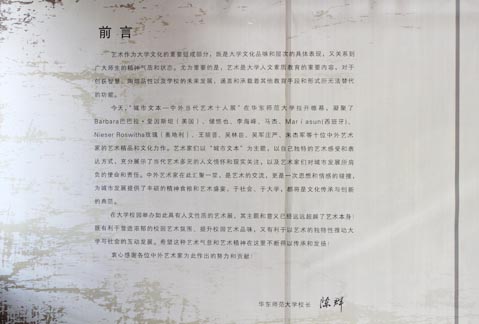 2012年11月17日,由国家汉办国际汉语教师培训基地、华东师范大学、上海市普陀区文化局主办的“城市文本”——2012中外当代艺术十人展在华东师范大学拉开帷幕。艺术展汇集了Barbara(美国)、储悠也、李海峰、马杰、Mar í asun(西班牙)、玫瑰(奥地利)、王劼音、吴林田、吴军庄严、朱杰军等十位中外艺术家的艺术精品和文化力作,展示了当代艺术的独创性