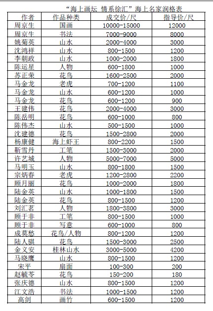 2013年1月“海上画坛 情系徐汇”海上名家润格表