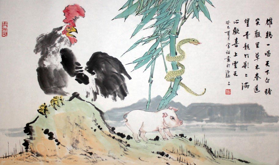 隋家祐擅长画山水、花鸟,他的生肖画亦十分引人注目,所绘之物皆栩栩如生,令人叹为观止,《鸡、猪、蛇》便是其中的代表。《鸡、猪、蛇》借动物之形生动形象地展现了三口之家的和睦生活,其中,高昂的雄鸡代表父亲,软糯的俏猪儿代表母亲,灵活的青蛇则代表女儿。