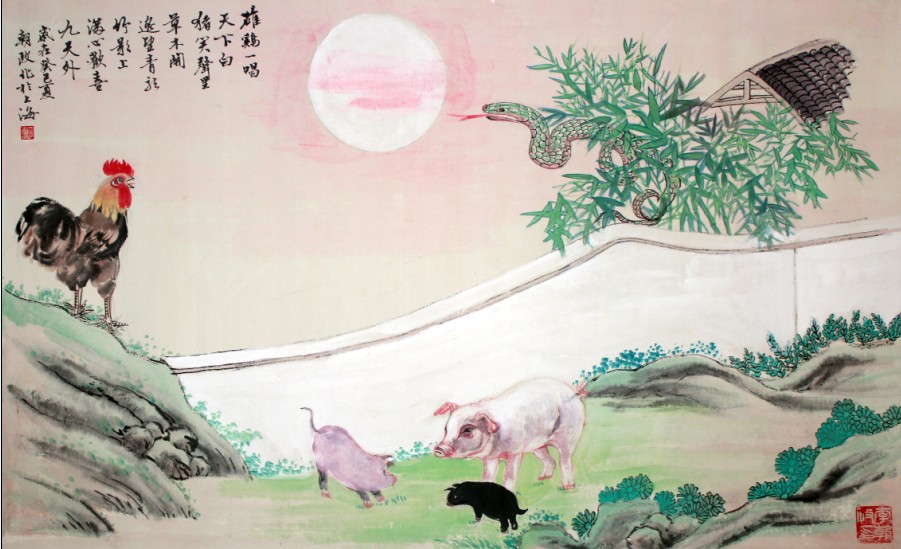 将雄鸡置于高处,显示出男主人公一家之主的威仪和气度,并用雄鸡唱响点染天地明亮,用女主人公的雍容富态展现生活的富足美好,等等这些都是三位画师的心灵相通之处。然而,与隋家祐和沈鸿祥不同的是,李朝政的这幅表现家庭温情的《鸡、猪、蛇》并未将三个主人公紧密地聚拢在一起,以显示夫妻恩爱、舐犊情深,相反地,李朝政老师用一截白墙将它们分散隔开,使画面在视觉上被切割成了三个独立的部分:鸡爸爸在他的领地里令吭高歌,恪尽职守地经营着它的事业;猪妈妈也有自己的生活圈子,它正在和它的猪朋友跳舞玩耍,不亦乐乎;而蛇女儿则在海外专心求学,在知识的殿堂里奋力翱翔。这三个独立之景虽貌离但神合,有如散文之妙——形散而神不散。画家正是通过这一手法来寓意家庭和美的另一种写照:一个完美之家并非要夫妻朝夕相处,儿女近在眼前,而是家庭中的每个成员都在努力地朝着自己的梦想和目标迈进,都活得潇洒恣意幸福满足,它们看似相望却相持相依,相互独立却永不分离,只因它们有着共同的终极目标和梦想,即让这个家越来越好。