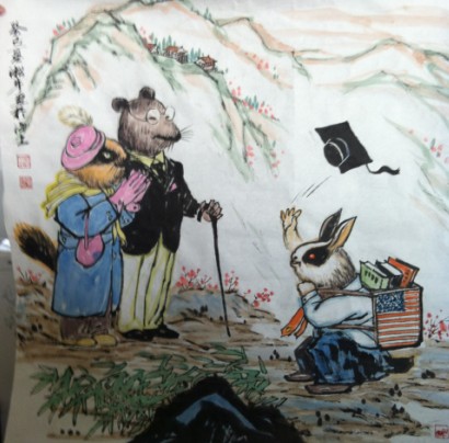 这是一幅双亲喜迎爱子求学归来、家庭欢聚的大团圆画面,画家独辟蹊径,用漫画的形式将生肖与人物完美地结合,更通过对主人公穿衣打扮、体态手势等细节的描摹,使画意的传达和呈现更直观完整。画中的鼠爸爸身姿挺拔、衣冠楚楚,圆框眼镜和黒木手杖的搭配,更凸显了它的绅士风度与深厚学养。鼠妈妈端庄地站在鼠爸爸身旁,漂亮的礼帽、柔软的丝巾、精致的手帕和时尚的靴子无不妆点着她的圣洁与美丽。这对鼠夫妻一个神采奕奕,一个双掌轻合,骄傲与满足、喜悦与激动之情溢于言表。兔儿子眼神明亮、双耳修长,聪颖可爱,它显然是从美国求学归来的,这从它书包中美国国旗的图案便可看出。当它看到久违的父母,竟兴奋地将博士帽抛向了空中。