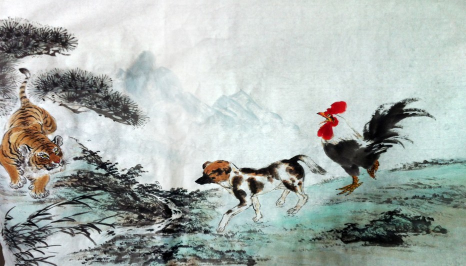 茫茫山色里,莽莽松林间,一只毛色华丽、威武雄壮的老虎昂首阔步地向山下走来,它肌肉壮实健美,眼神如火似炬,颇有百兽之王的风范。箭步相迎的是望子心切的狗妈妈和喜不自禁的鸡爸爸,它们一个披着花白衣裳欢快地在前,一个挺直了身板紧随其后,青山绿水在它们脚下飞速划过,激动与兴奋刻不容缓。近了,更近了,儿子的身影就在眼前。