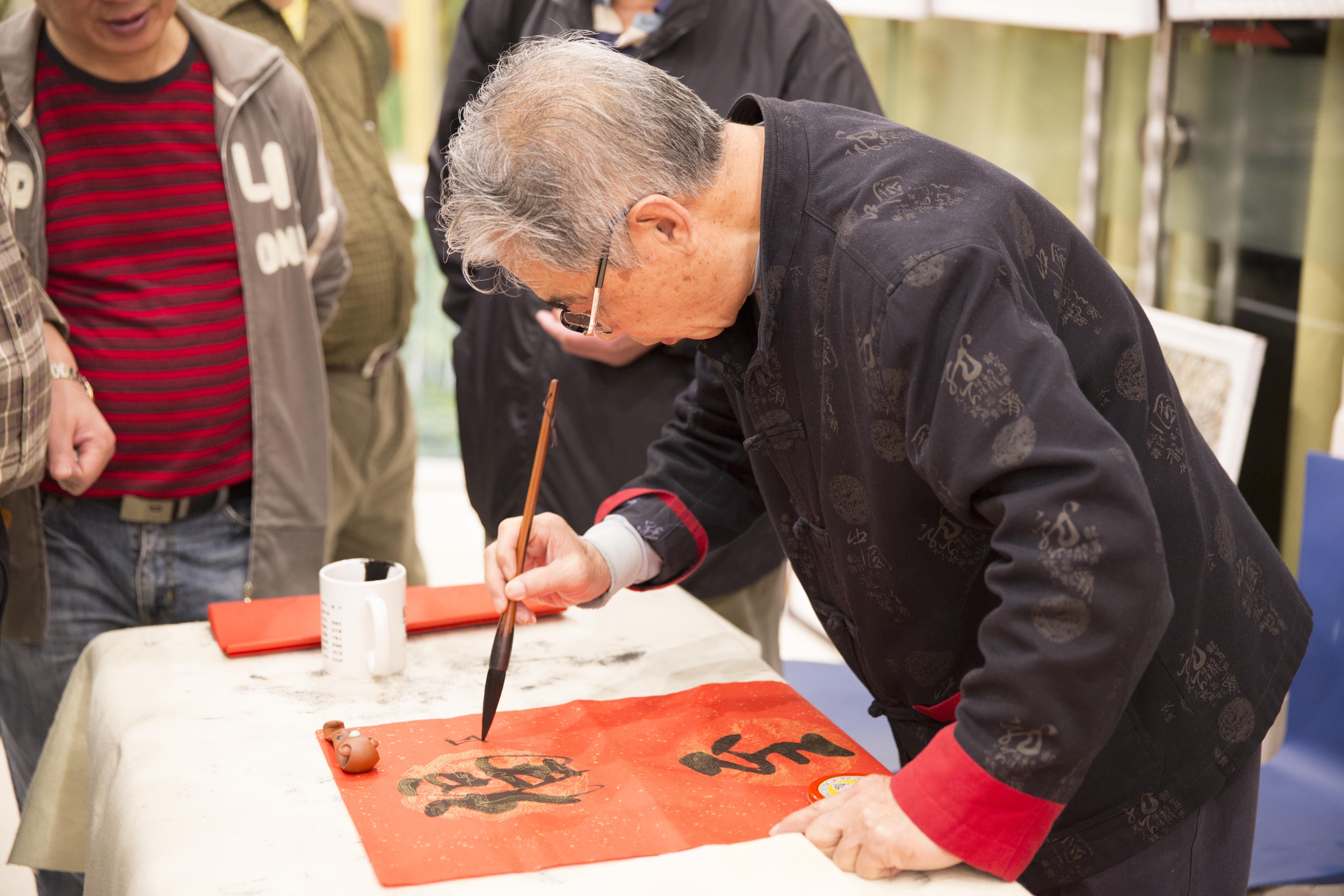 黑色,对襟服。白发,细镜框。虽是初来乍到,却人气很旺,围着看他运笔舞墨、谈天索字的人络绎不绝。短短一天,他的成交量便攀居书法类的榜首。听来往的人说,他是书法的游子,终日畅游于名山大川、金石笔墨之中,忽至徐汇,适逢第八届“海上画坛·情系徐汇”画展暨笔会举行,便携笔墨纸砚,踏寻知音而来。这样潇洒优雅的生活姿态,令我动容。