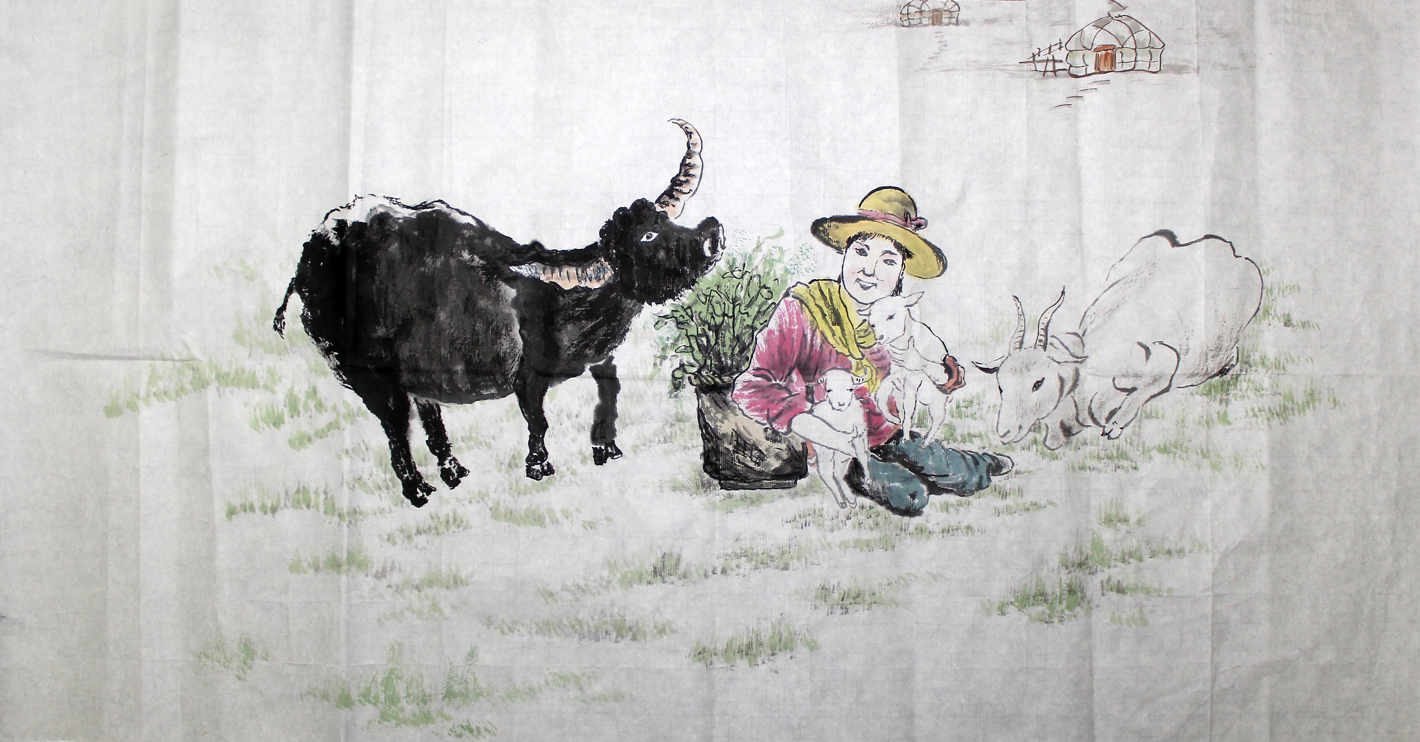 这是海上著名山水画大师沈鸿祥为一对年老伴侣所绘的生肖图。虽取景于“天苍苍,野茫茫,风吹草低见牛羊 。”的蒙古风光,远方的蒙古包也依稀可见,然草原的着墨却不多,草色似一种岁月磨成的清淡,没有苍茫的风和雄壮的歌,但我竟听到了马蹄琴的长调,还有历史悠远的回音。画面中的牛与羊,黑白分明,姿势各异,一个踏着草地,神情欢喜,似在叨絮,一个俯身于地,说不出的满足休闲,它是在全神聆听,还是在回忆往昔。风或许知道,这世外桃源般的疆土里,它们曾留下了哪些浪漫妙语。但那相守而望间的淡然默契和朴实温情,自牧民心领神会的微笑、自然流露的艳羡里,我或许聆听到了一二。温顺如牛,守善如羊,白云苍狗,风云依旧。年年岁岁,岁岁年年,容颜与激情或许沧桑变化,但并未见时光在这片草地上留下的褶皱伤痕,相知相守的乐趣如那盆中枝叶,浓密蓬勃,在这辽阔天地间,博大永恒。