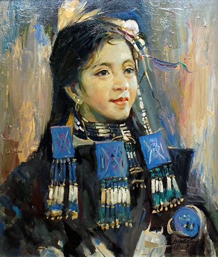 印第安人与我们同为黄种人,他们淳朴善良,信天灵,尚自然,对世间万物都抱以敬畏的心态,如画中宝蓝色的鱼骨挂饰和项链设计,都是来自大自然的灵感启迪。徐纯中用松动而流畅的笔触,再现了印第安少女的静美仪态和浪漫情怀,外光从侧面倾泻在她微扬的唇角、落进了乌黑的发里,透亮的双眸如泉水般清澈,仿佛装进了满世界的纯真、住进了千万年的信仰。