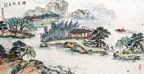 《归见柳色》、《觅秋览山色》,画里的山山水水都飘渺柔和,意境阔大,充满了浓郁的古典气息。而杨柳、竹林、瓦楞、松柏却一丝不苟、清晰可数,让我们惊叹于他的深厚功底和细腻心思。大而含细、层次分明,是朱忠明仿古山水的特点,是他师古而不拘泥于古的开拓。山外有山、亭外有亭的反复,青色、黄色与绛色的错落,给人以丰富的画面美感和无尽的想象空间。无处不在的行舟者、垂钓者和过桥者,或老迈或年少,或追寻或等待,他们在娟秀的湖光山色里,与谁重逢,因何迷失,我们不得而知,但身外精雕细刻的万千风景里,我们窥见了一种对“归”的遥望和“觅”的深情。“身在繁世,心在归程”,这大概便是朱忠明仿古山水里的细腻内涵了。