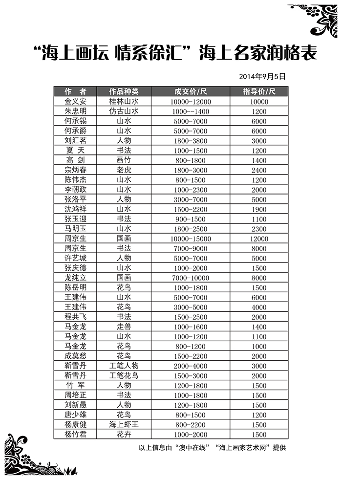 第十二届“海上画坛·情系徐汇”海上名家润格表