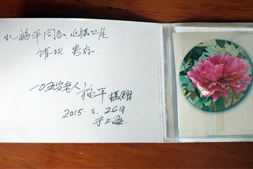 前不久,老先生还去参加了牡丹展,并将其拍摄的牡丹相片,制作成影集,赠送给华东师大的诸多老教授和与他同名同姓的施平先生,还在每本相片集上写上受赠者的名字。看到由陈佩秋题词“名家艺海”的画报,老先生更是高兴不已,提笔在报上写下“105岁老人施平于华东医院阅”,以作鼓励。