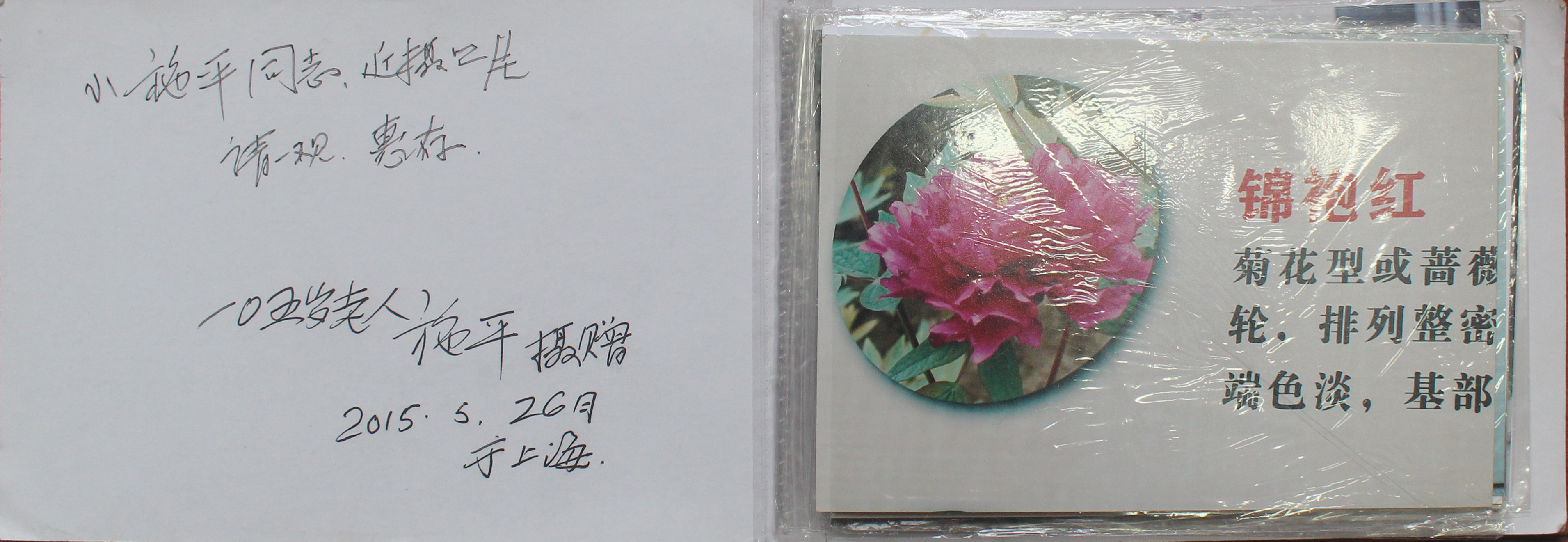 还是在去年六月,正值百花怒放牡丹盛开荷花吐艳之时,施平去华东医院病房拜访百岁寿星老施平。老施平和蔼可亲,没有半点官架子。见到施平亲切地称他“小施平”,说自己是“老施平”。在整洁干净的病房里,小施平犹如来到知识丰富的海洋。病房像书房,书籍满屋、诗画盈香。墙上挂着书法作品:“老年更发少年狂,吟啸徐行又起航。精品千帧情胜最,领我追梦享夕阳。”此诗道出老人的心境。这是学生读老施平摄影集有感而写的。原来老人家喜爱摄影,出版过多本摄影集。他拿出前不久参加牡丹花展所摄作品,将两幅牡丹照片赠送给小施平。老施平还一笔一划在照片上题写:“小施平同志,近摄取牡丹相片,请一观,惠存。105岁老施平摄赠。”字,写得端正道劲,手力不减当年,拳拳之心可鉴。