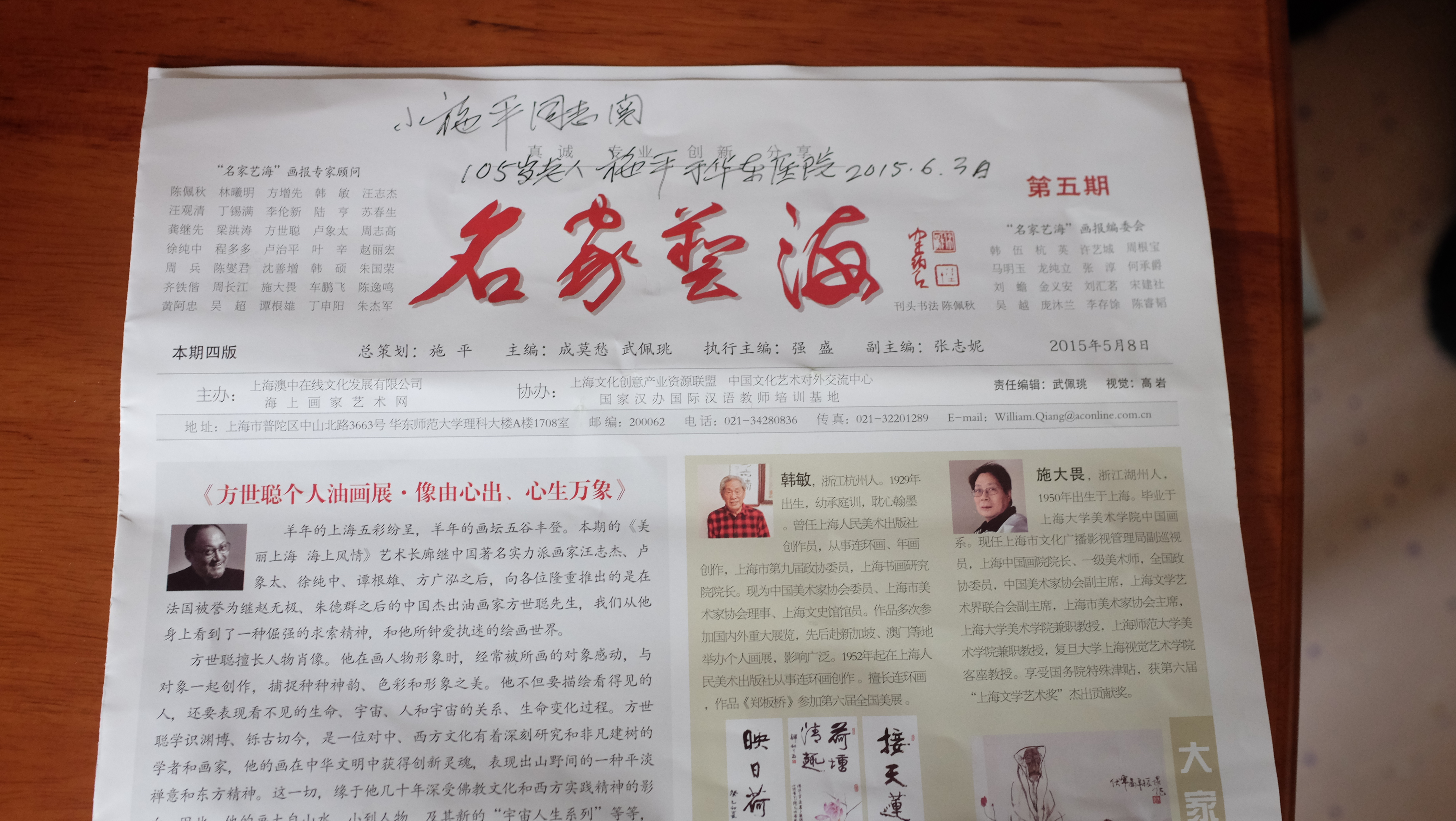 每逢佳节倍思亲。在快过年的前夕,最让年轻的施平惦念的人是与他同名的105岁寿星老施平了。他还好吗?现在过的怎么样?身体健康吗?老施平是一位德高望重的革命老前辈,曾担任华东师范大学党委书记等。五十多岁的小施平也是共产党员。在华东师范大学一所楼里创办“海上画家艺术网”,又任《名家艺海画报》总编,是上海著名艺术策展人。他听说了老施平的故事后非常仰慕,萌生了想见见老施平的愿望。华东师大教授包汉中、李天任、汪祥云等知道了施平的愿望,便积极引见,促成了一段缘分。