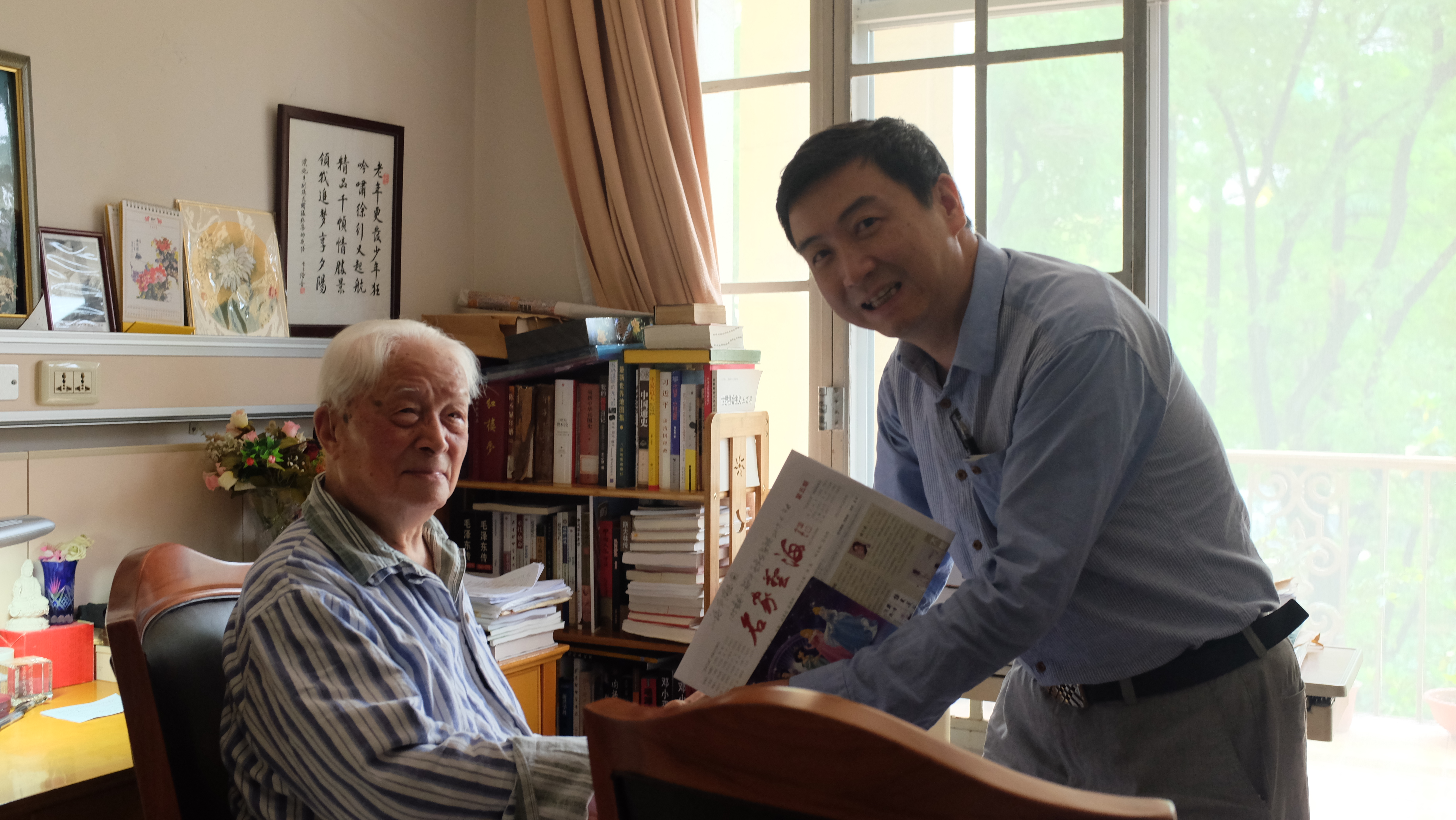 小施平还关切地询问老人生活,老人一日三餐清淡,生活很有规律。老施平晚年以摄影、旅游、读书、写作自娱,被人称为人老心不老的“文艺青年”。平和怡然开心的生活,是他的长寿之道。