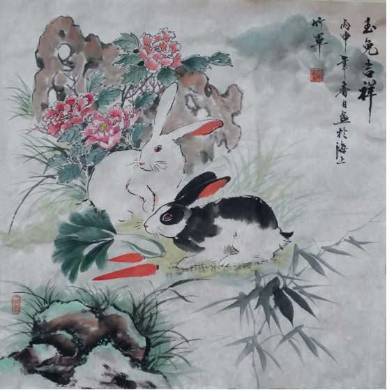 在中国,“兔”即是神瑞之兽,又是吉祥之物,古书上的“广寒宫”连带着的“金乌西坠、玉兔东升”的词,不是无故就来的,他代表着的是民间对于未来、现在乃至家庭的一种美好愿望的寄托和承接,其中浸润着是一种十分深厚的民俗情节和心念寄许,用在画上说,就是一种寓意与物象的融合,而拜习于黄胃、范增等大师的上海著名画家竹君的国画《玉兔吉祥》表达的正是这样的一个主题。
