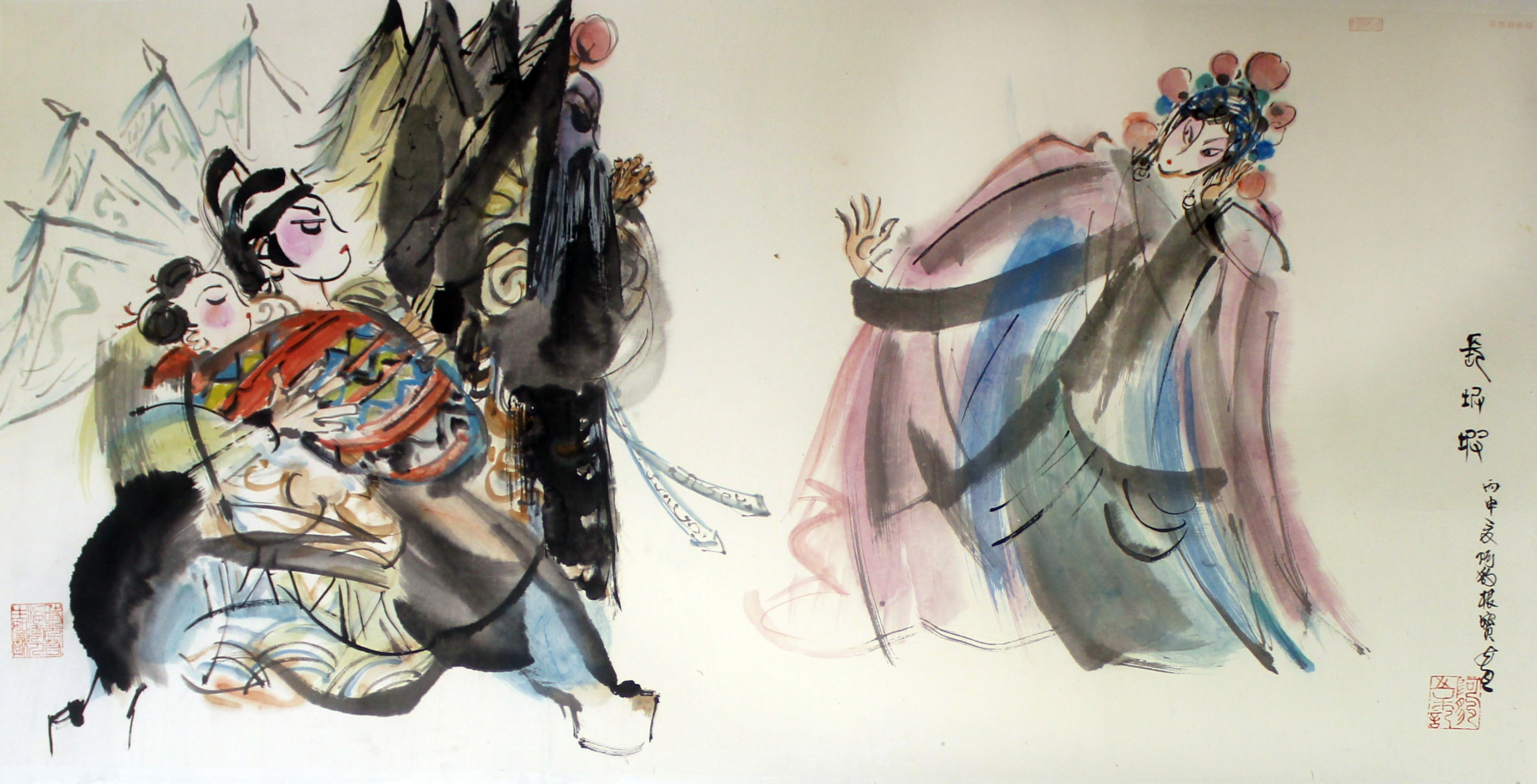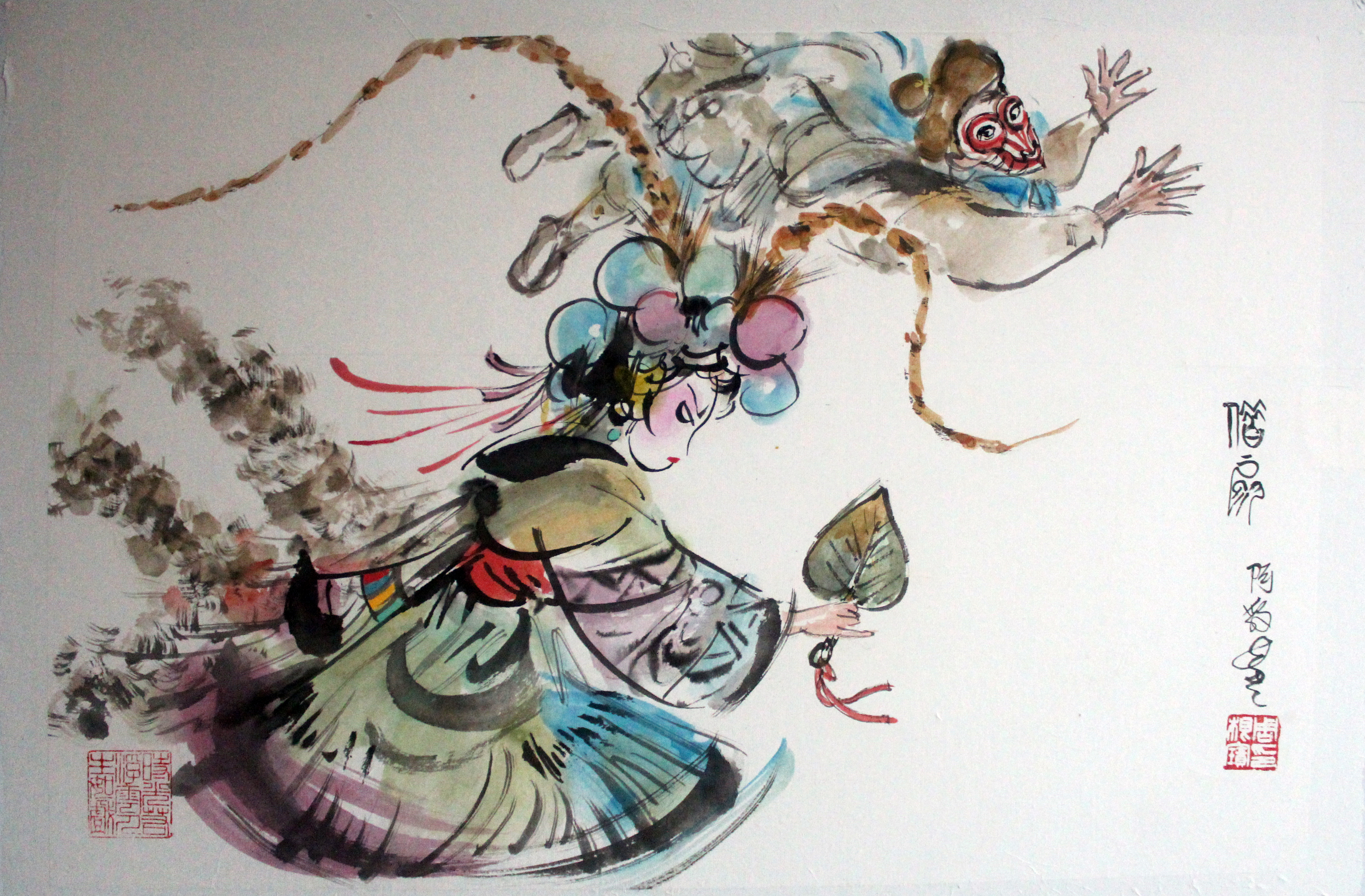 旅美画家周根宝,师从谢之光、方增先、程十发等大家,在众家画风的融合中创新绘画风格。上个世纪80年代接触戏曲人物画后,创作硕果累累,90年代旅美经历中,又糅合西方画技,将戏曲人物画赋予生命,打造戏曲张力。此次展出的《借扇》,运用动感的弧线及枯笔等表现出孙悟空的机灵与调皮,又用写实的技法将铁扇公主美态从服饰、帽子、装饰中衬托出来。在周根宝的眼中,这就是一出喜剧,虚实结合,浓淡相结,将武斗的场面展示的惟妙惟肖。