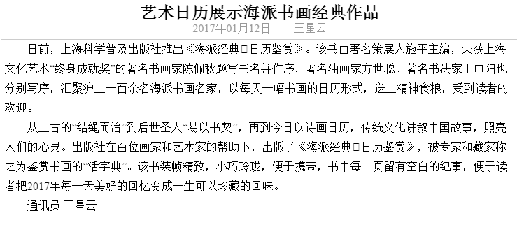 《东方城乡报》刊登《艺术日历展示海派书画经典》