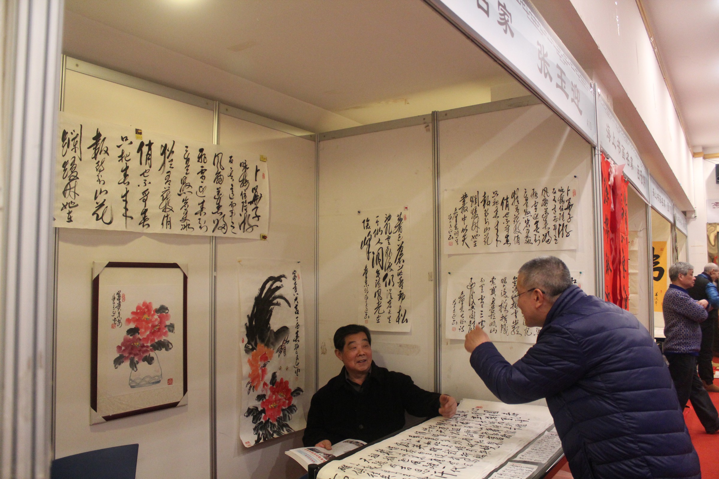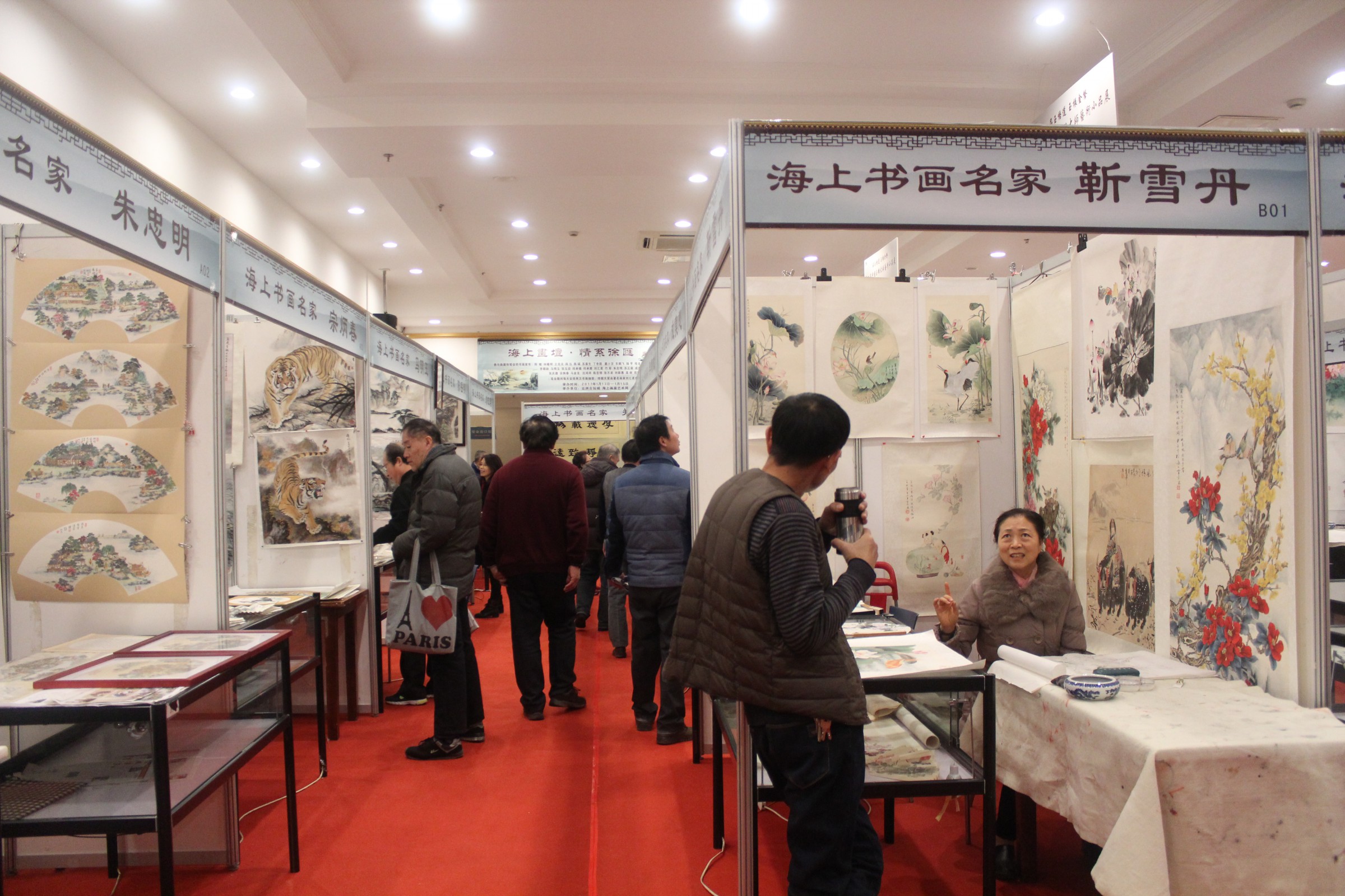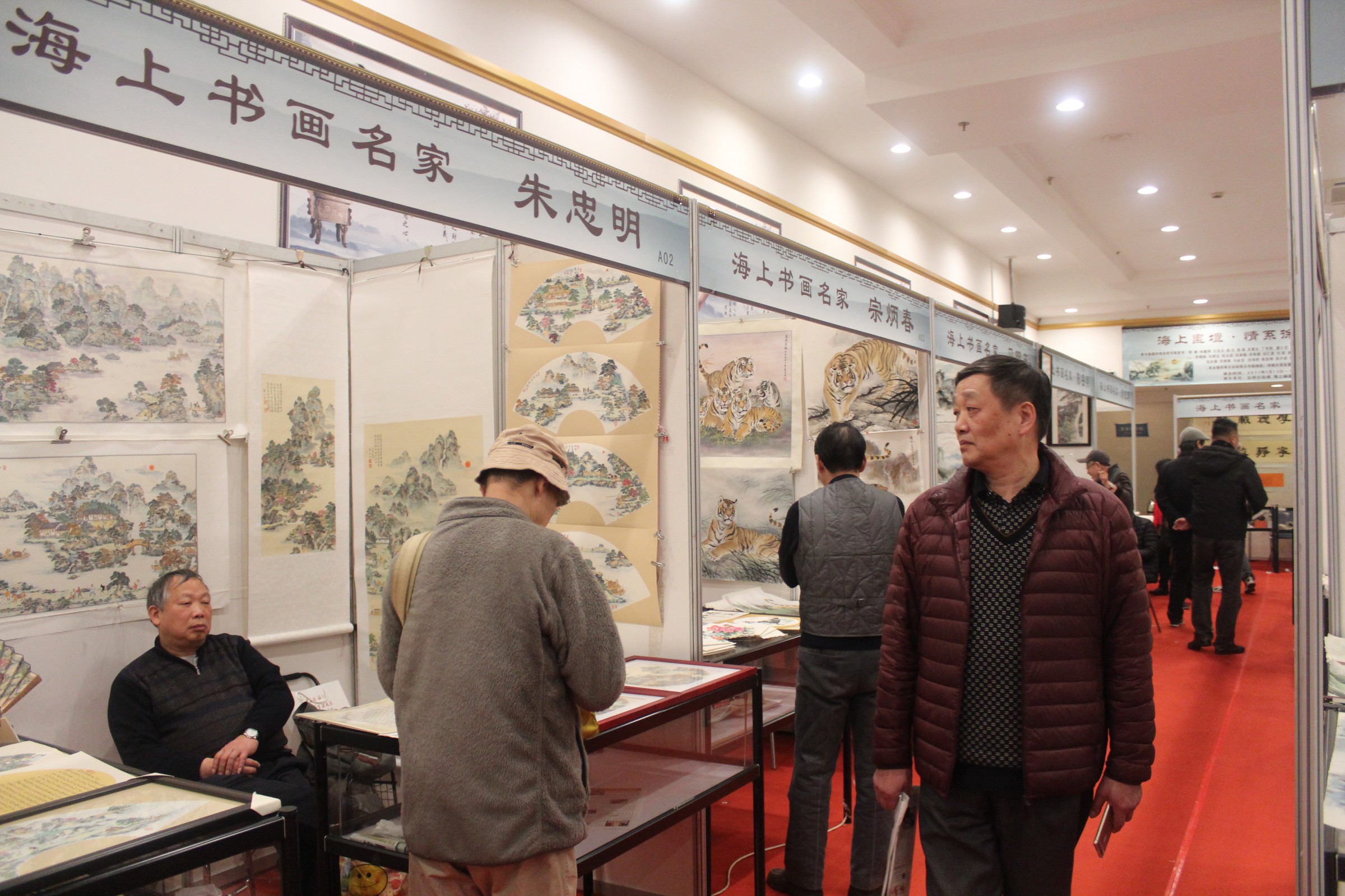 本次笔会韩敏、林曦明、王克文、韩伍、韩硕、苏春生、丁申阳、戴小京、车鹏飞、梁洪涛、吴越、刘小晴、陆亨、程多多、周根宝、靳雪丹、金义安、朱忠明、何承锡、何承爵、张玉迎、李朝政、马明玉、刘汇茗、张庆德、夏天、宗炳春、马金龙、张洛平、竹军、沈鸿祥、苏正荣、陈岳明、张不求、刘新愚、成莫愁、高剑、郑明正、杨康健、吕云炜40位书画名家、书画精品齐聚云洲古玩城。书画家现场时而泼墨挥毫,时而笔走龙蛇,妙绘丹青,一幅幅作品都别具灵气,生气盎然。那色泽饱满的山水,精雕细琢的繁花,个性张扬的狂草、端庄精致的楷书无一不展现出笔者的技法与风采,引无数观众前来观赏、询问,有不少观众现场洽购,将心仪之作购置回家进行收藏,更有甚者,购置多幅作品当做新年礼物,将海派文化的祝福带给更多的人。这一举动也证实了书画收藏成为当前市场投资的一大潮流,越来越多的人愿意并希望加入到书画投资行列中来,每一个人都是海派文化的传播者、传承人。