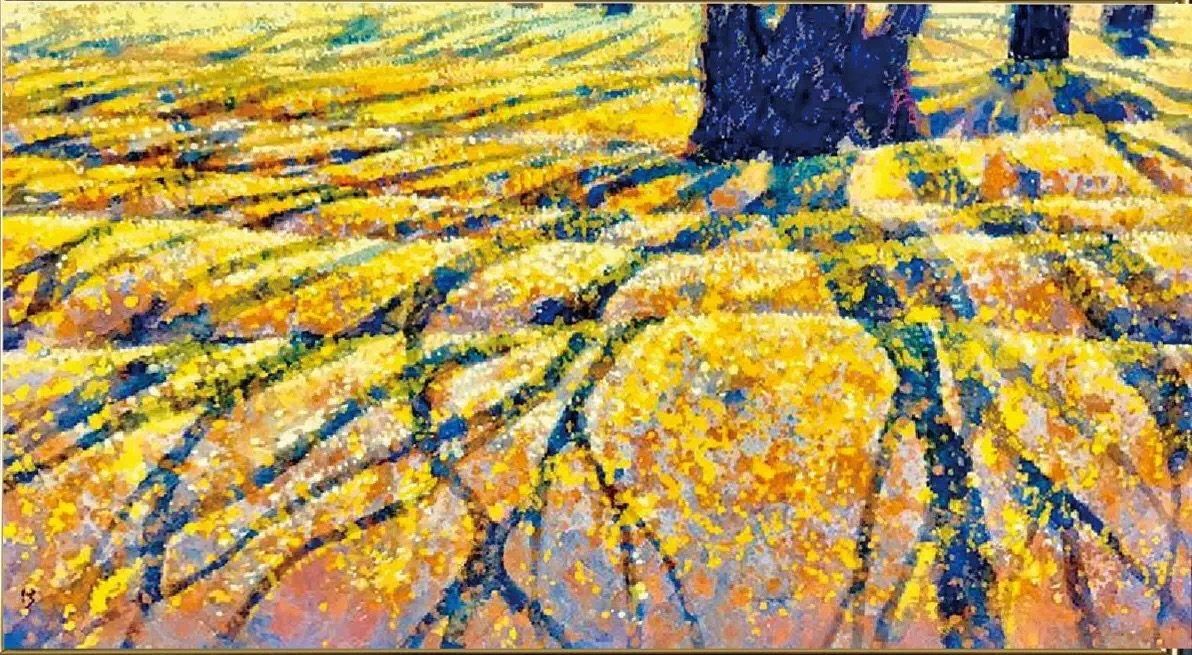 齐铁偕的现代水墨画追求大胆创新。大自然千变万化,艺术创造也应万变千化。他笔下的彩墨画,打破艺术的疆界,用画来表现诗,用诗来酝酿画,最后再用书法来画龙点睛,堪称一绝。他常言道,“我想让诗、书、画三者融会贯通,把流动的时间凝聚在一幅画里,再把这种感动留给观众”。这种感动,既有水墨画的别致韵味,又巧妙地将印象派的风格融入中国画,糅合西画的光、色、影,运用中国的平远、高远、深远法,这些具有现代油画般的厚重质感和形式感的水墨画,具有很强的视觉冲击力,呈现出的是一幅幅能够“呼吸”的鲜活作品。