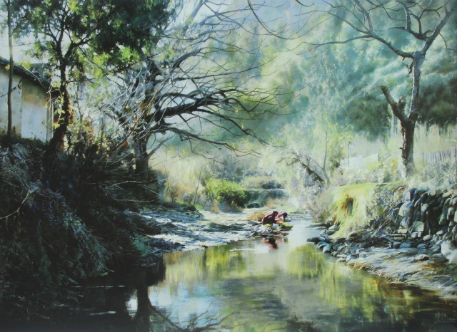徐伟德有一幅《桃花潭随想》,他告诉我,画里的桃花潭,是安徽泾县一个特别漂亮的地方,李白和汪伦就在那里分手的。从上世纪七十年代至今,他累计去了泾县二十多次,每一次都能想起李白的诗:“桃花潭水深千尺,不及汪伦送我情”,想起那时的李白是寞落的,文人与文人的萍水相逢、推心交往,在这样的特殊时期、诗情画意里怎么不肺腑感人?我不知道徐伟德为什么一生都在坚持画皖南,但从这个故事里,我看到了他挥之不去的情愫。