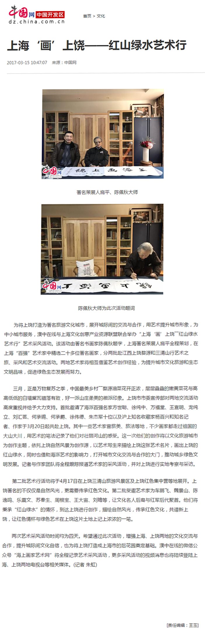 为将上饶打造为著名旅游文化城市,展开城际间的交流与合作,用艺术提升城市形象,为中小城市服务,澳中在线与上海文化创意产业资源联盟联合举办“上海‘画’上饶――红山绿水艺术行”艺术采风活动。该活动由著名书画家陈佩秋题字,上海著名策展人施平全程策划,在上海“百强”艺术家中精选二十多位著名画家,分两批赴江西上饶婺源和三清山行艺术之旅、采风和艺术交流活动。两地艺术家将相互借鉴艺术创作经验,为提升城市文化旅游和生态文明品味,促进绿色生态发展而努力。