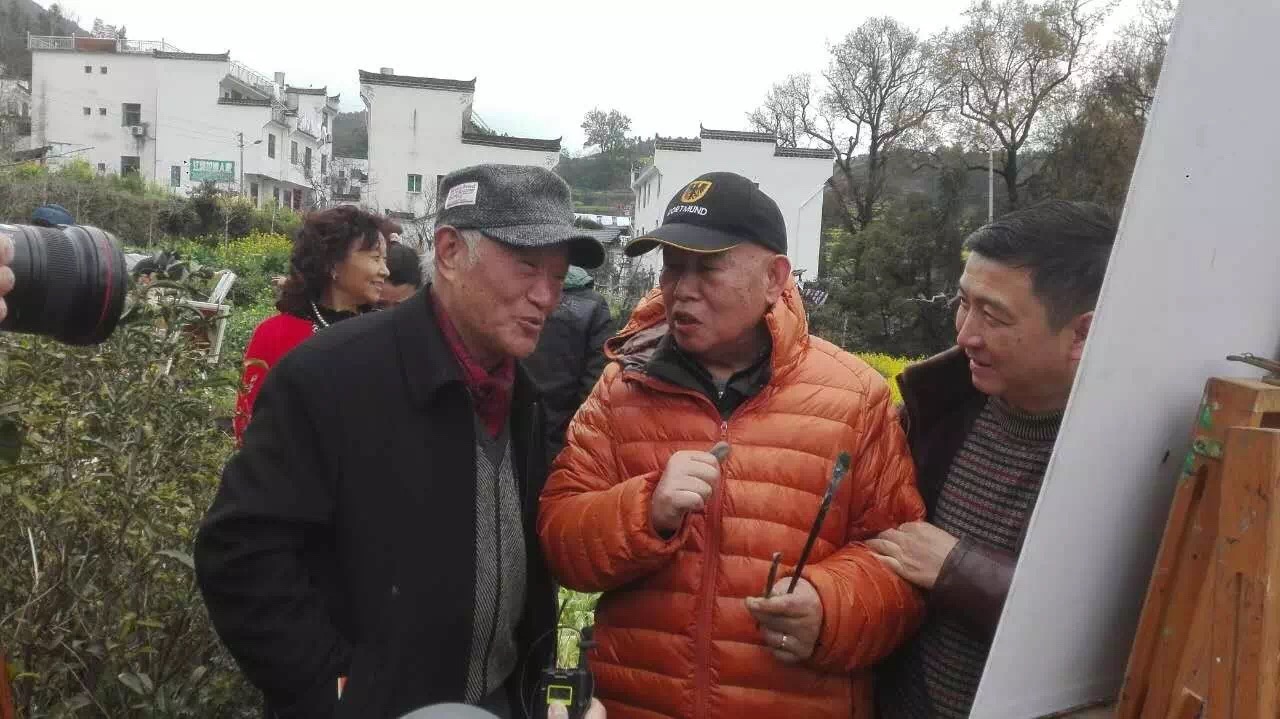 方世聪、龙纯立两位艺术家相识于六十年代,因婺源之缘又重逢了。方世聪无私拿出画画工具令龙纯立十分感动,连声感谢并说“我要好好画,努力描画出全国最美乡村婺源的动人美景!“在今天上午,龙纯立一连画了几幅速写,其中画著名演员牛犇头像 ,令在场人羡慕不已“真像!像极了!“
