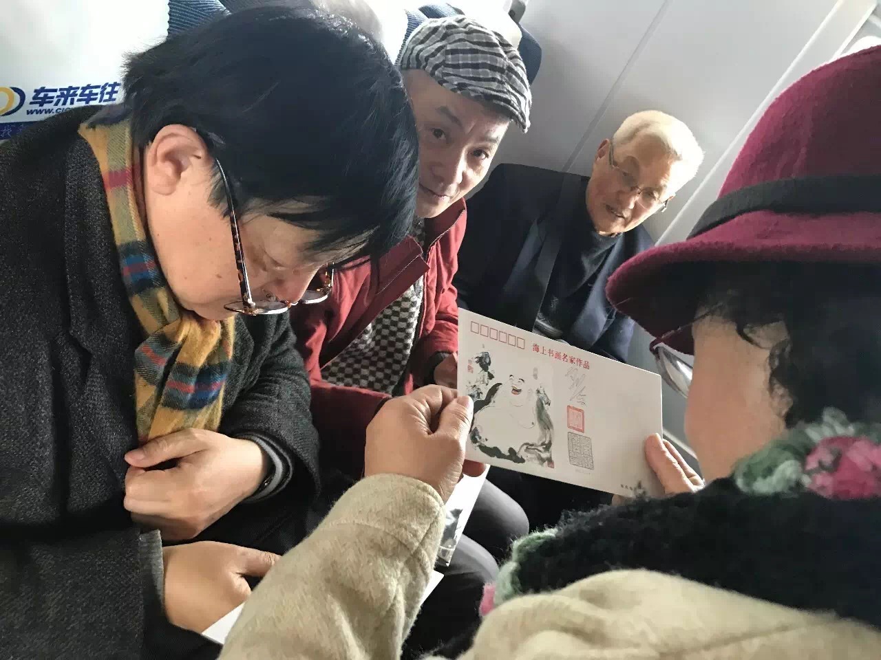 那是一枚首日封一一刘汇茗2015年11月14日,为“我热爱,我设计一一海派艺术纪念封自我设计”活动创作了一幅人物画“童子戏弥勒”,构图独特谐趣盎然,造型生动,大肚弥勒仰天大笑,六个童子欢乐雀跃。他将首日封送给上海牡丹画院院长王宣明丶油画家徐纯中,作家兼画家成莫愁等人,大家拿到首日封,都被画面上的弥勒和童子逗乐了,笑口常开,才能活得精采。收下刘汇茗的首日封,也收下了在婺源结下的深厚情谊。