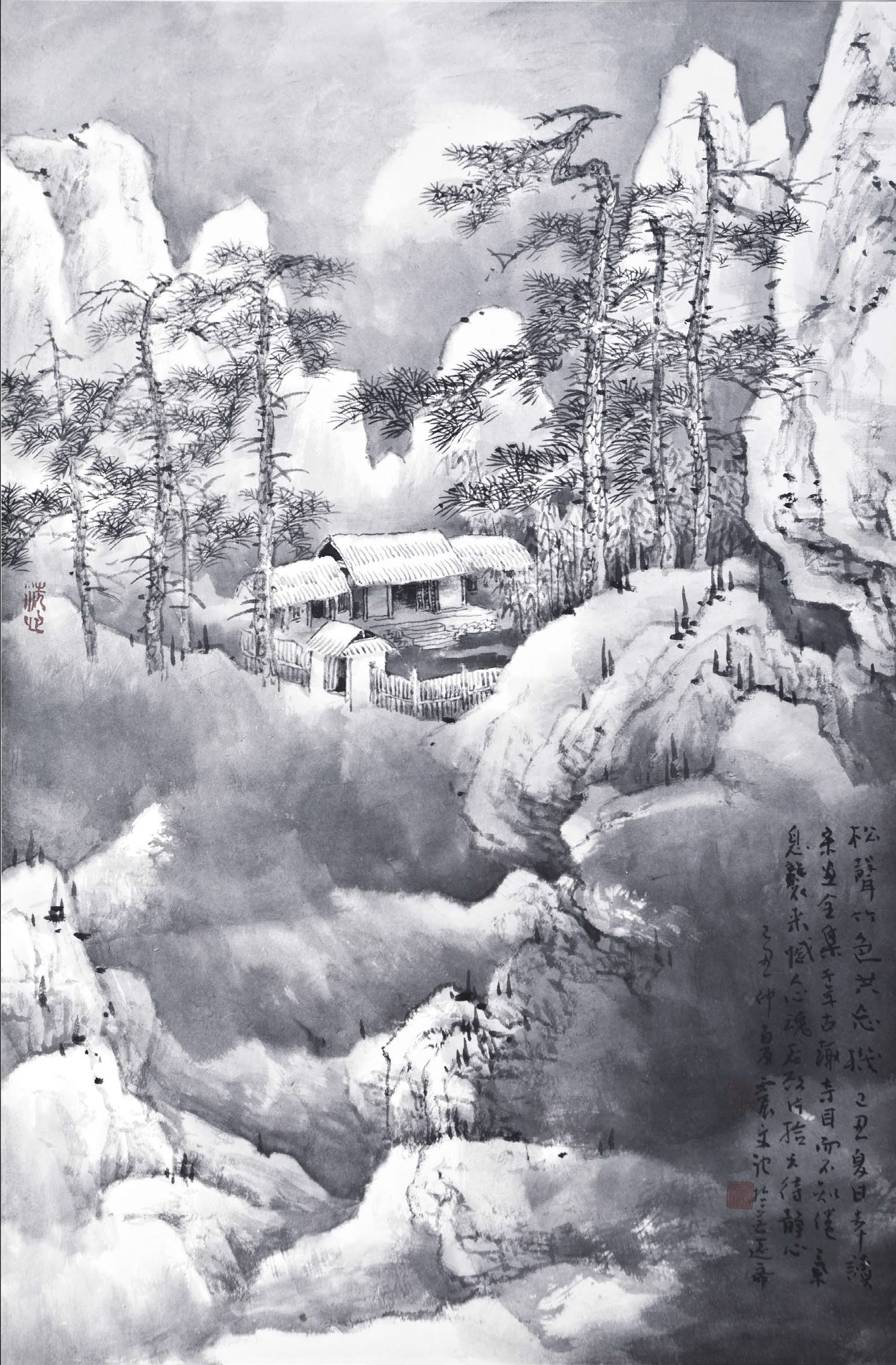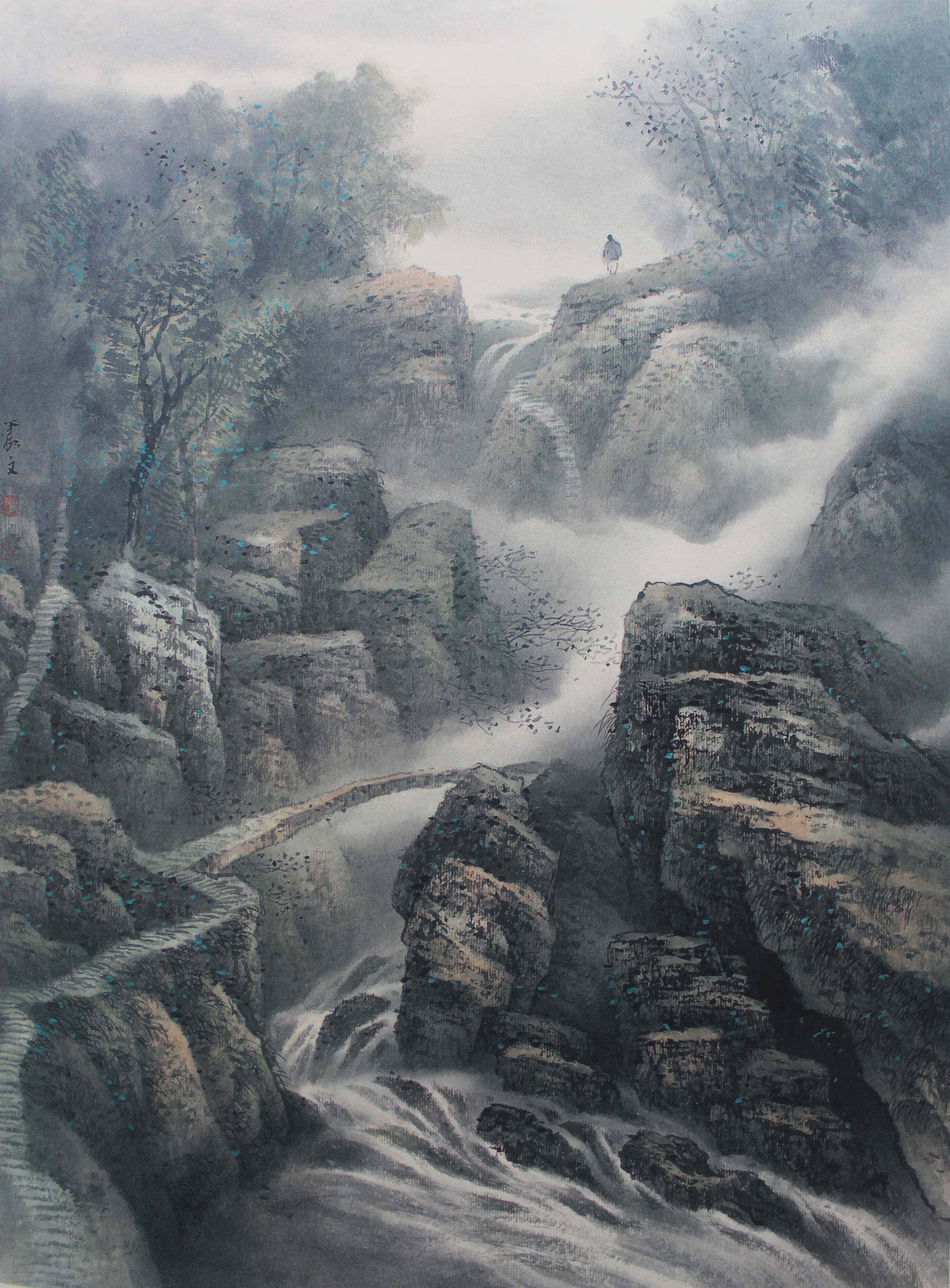 有了传统的滋养,加上多年的山川游历,甚至走出国门,东渡日本,时间的磨砺与考量,也形成了他典型的“乐家云水”画风:山水营造与综合视觉结合、传统笔墨与现代构成并重、绘画语汇与艺术哲学相兼、自然节奏与人文节奏统一。《潇潇暮雨洒江天》以传统笔法,绘现代构成,山水显隐,时空交叉,云峦交错,雾霭弥漫。在《千崖叠障》中,画家又着力寻找着自己的艺术观念与绘画语言,生动表现出大山的性格、云雾的脾性、远树的神采、近壑的气韵。但无论风格、技巧如何嬗变,他画里的深情一如既往,山水江南,一片天真。