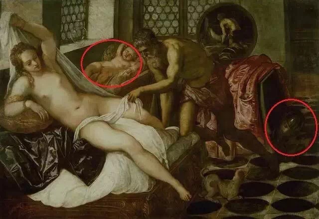 丁托列托的这件作品,描绘了捉奸现场的丈夫、妻子、男小三的瞬间,古典绘画的“娱乐性”可见一斑:豪华卧室里,丘比特已经熟睡,维纳斯倾斜着身体,武尔坎努斯掀起妻子下半身轻薄的内衣,想要搜索出轨的证据,可妻子一幅无所谓的态度,就这么岔开大腿随丈夫检查。画中还有一个不易被发现的点:柜子下面藏着一个全副武装的男小三——战神马尔斯。