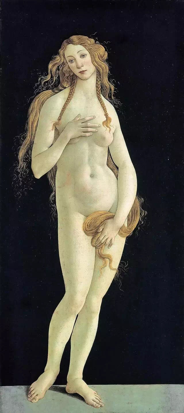 画中:少女维纳斯刚刚浮出水面,赤裸着身子踩在象征她诞生之源的贝壳之上,她身材修长而柔美,体态丰满圆润,婀娜端庄,一头蓬松浓密的散发散落在光滑柔润的肌肤上,让人赏心悦目。