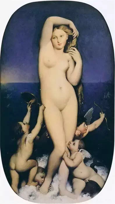 1848年,安格尔完成了《阿纳底奥门的维纳斯》。这幅油画是安格尔另一幅享誉世界的经典油画《泉》的前身,两者的构图,人体的曲线都是一样的,《泉》中的少女可以认为是维纳斯的化身。