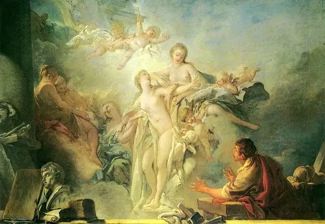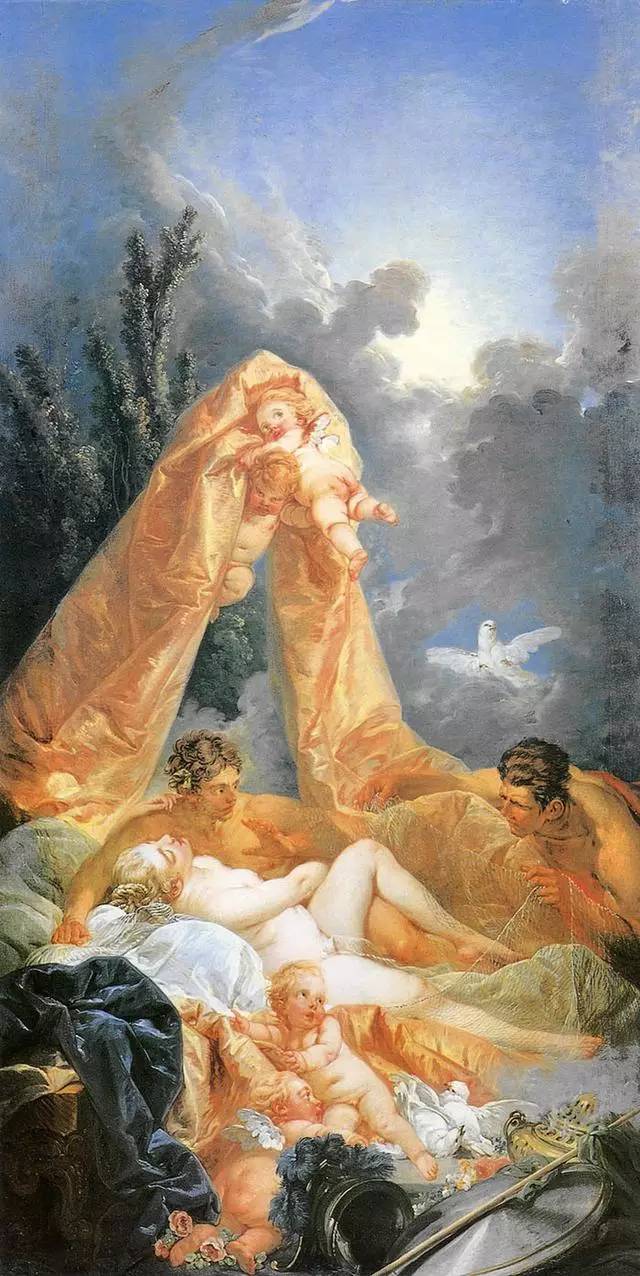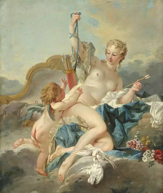 布歇是洛可可艺术特征最突出的体现者,他也被称为“向妇人献殷勤的洛可可画家”。这幅画是庞毕度夫人为最喜爱居住的贝尔维尔宫的梳妆房内装饰,委托布歇所绘制。画中的丘比特和鸽子是维纳斯作为爱神的象征,花朵暗示维纳斯是花园的守护人,而珍珠是在叙述维纳斯从海中诞生的神祕故事。