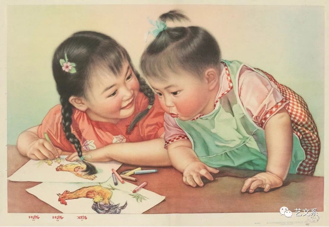 一幅“咯咯鸡”,是婴儿期的张弛,看着姐姐画大公鸡;另一幅“穿木珠”,当时社会影响也很大,很多的热水瓶、脸盆上都印了这幅画。画面是一对女童在穿珠子。女童就是张弛的姐姐。