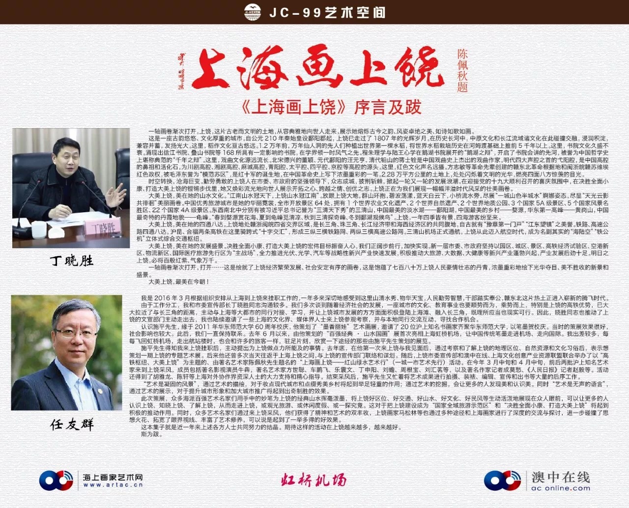 今年3-4月份,我们澳中在线组织了上海的艺术家、企业家、收藏家、作家、文学家、记者等30多人到上饶采风考察、用文字、绘画和摄影的方式阐述“高铁枢纽 大美上饶”,8月编辑成《上海画上饶》一书,多方面多角度展示了上饶形象。今天,我们把书中的经典部分放在上海的窗口——虹桥机场集中展示,主要是想把伟大的上饶人民,把上饶的“红”山绿水,把上饶的建设成就介绍给上海人民,介绍给全国人民,让更多的人了解上饶和知道上饶。最后,向英雄的上饶人民致敬!