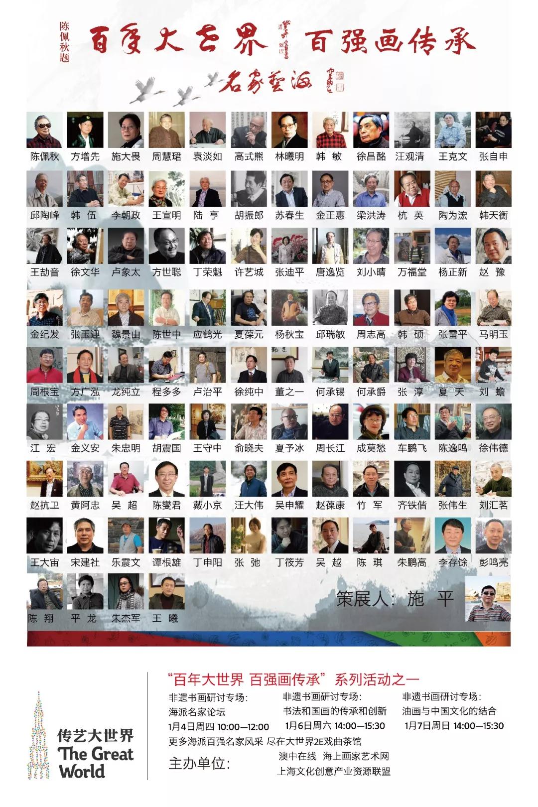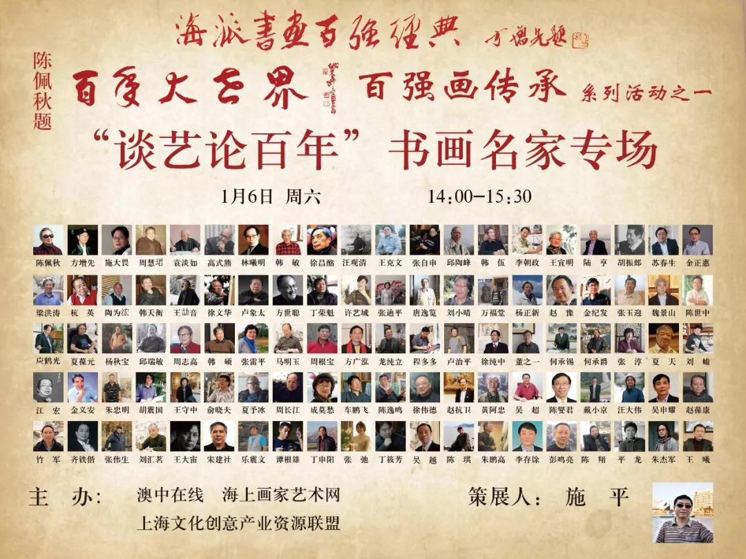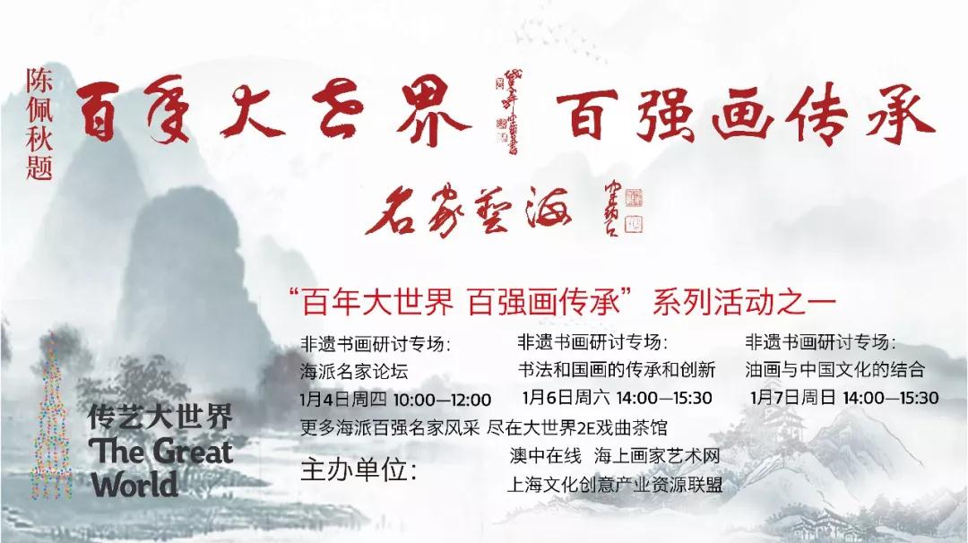 “渭城朝雨浥轻尘,客舍青青柳色新”。1月6日下午,修缮一新,致力于非物质文化遗产的“传承、传艺、传习”的大世界,迎来了一批当代百强书画名家。海派大师陈佩秋亲自题写"名家艺海","百年大世界"、方增先题写"海派书画,百强经典"。由澳中在线、上海文化创意产业资源联盟、海上画家艺术网联合举办的“谈艺论百年”书画名家在此展开第二场研讨会。场内与场外,台上与台下,形成以大世界为轴心,谈书画艺术与个人创作为幅射的别具一格的论谈,呈现海上画派的五彩斑斓,个性与传统的契合。