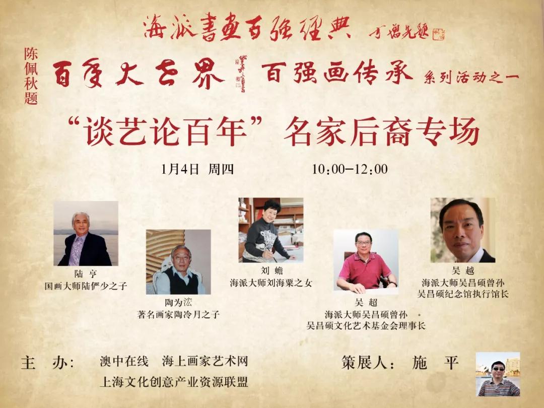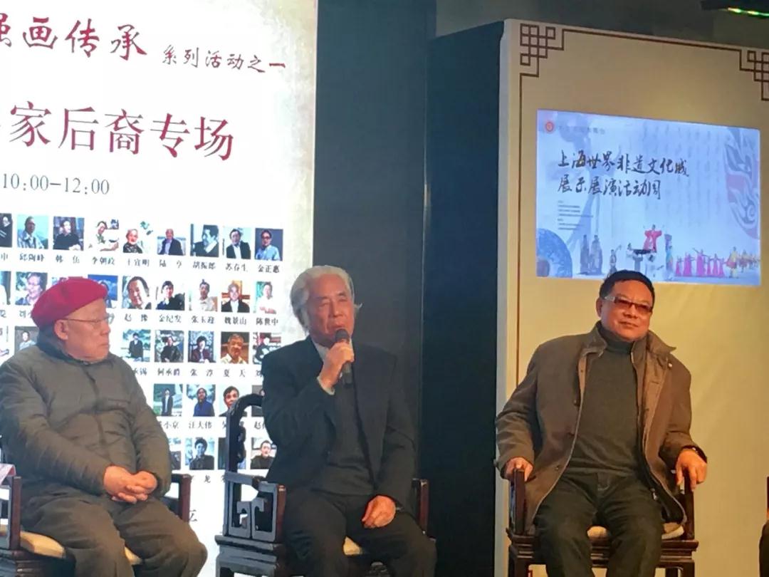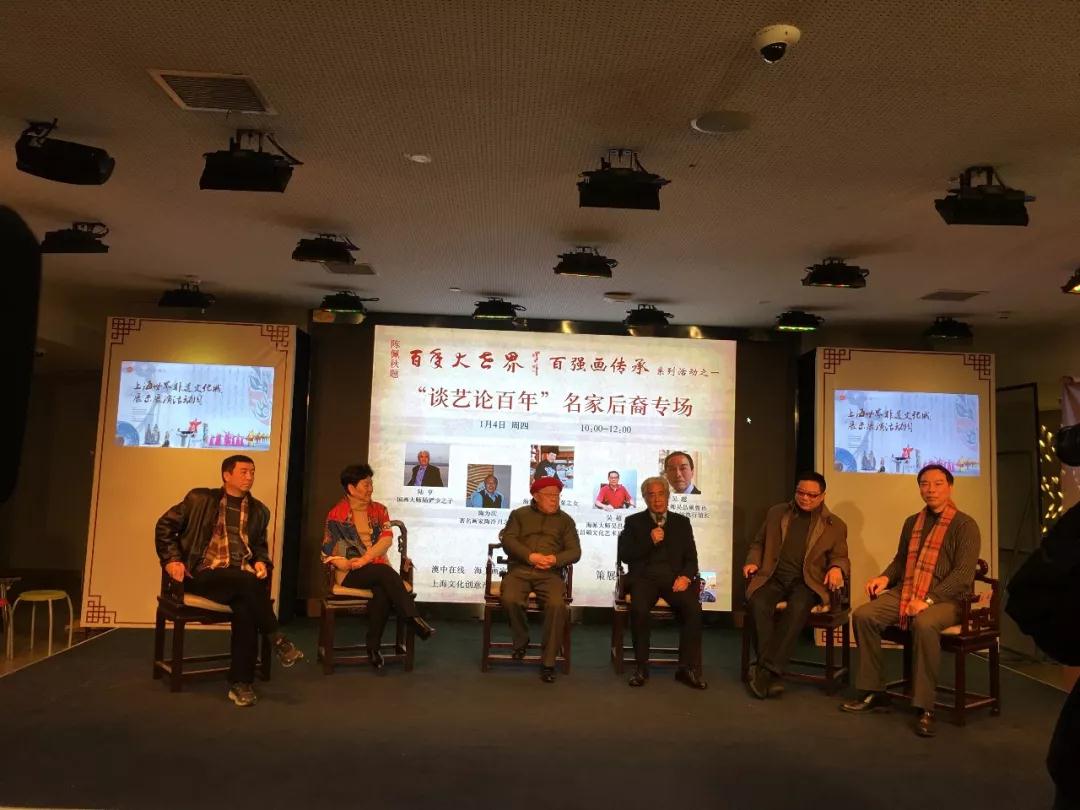 在宽阔的舞台大屏幕上,轮番滚动播出海派百强名家的照片。两边柱子上,小型电视屏幕正在播送五位名家后裔的简介,在海上画坛,他们代表着新一代名家后裔发声。