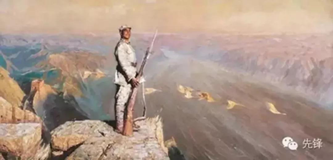 我曾经去看过实景,拿把枪在高山之巅是不现实的,山的下面就是滔滔不绝的黄河,人在上面站立很难保持这样的姿势,但这就是艺术创作的魅力所在,这里确实画得很有灵性之处。