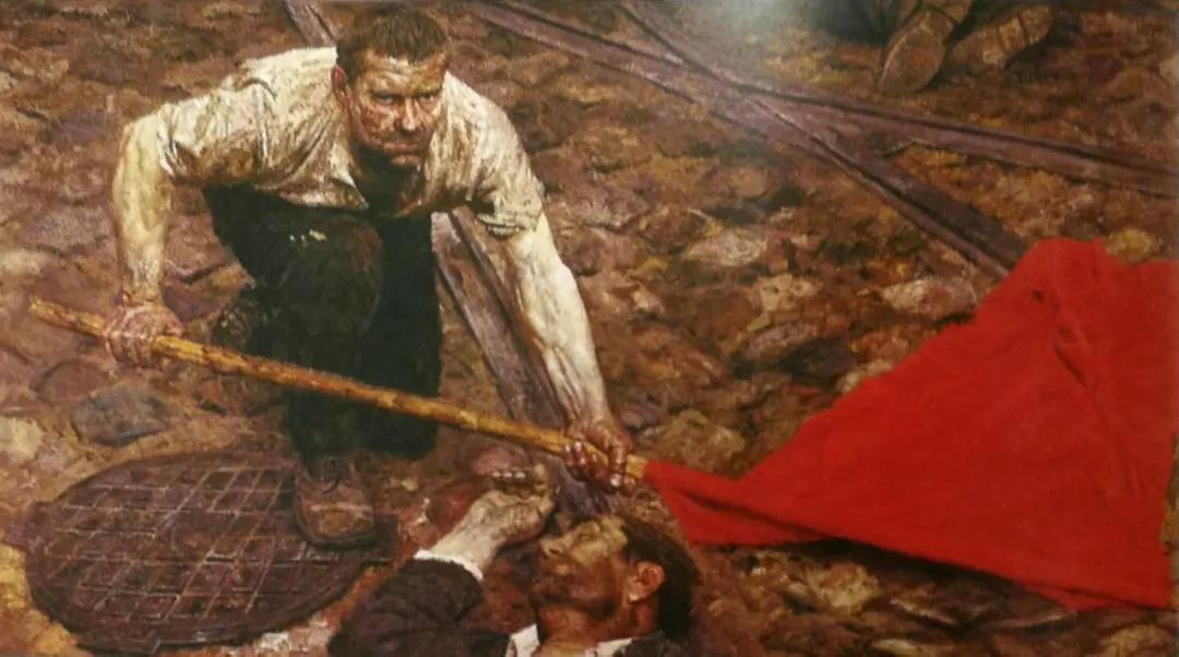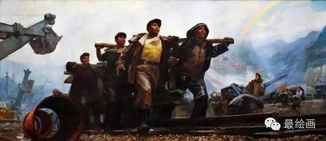 当时陈逸飞去上海梅山体验生活以后创作的,名字叫做《开路先锋》,那时候的口号“铁路先行”,也象征着我们现在朝着正确的道路发展。