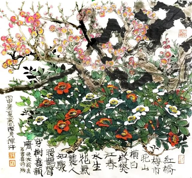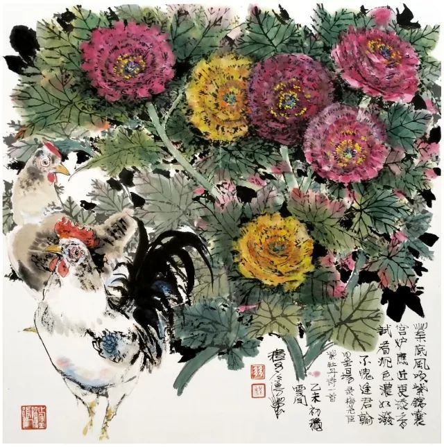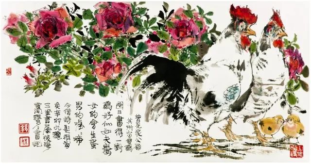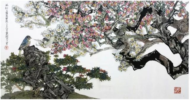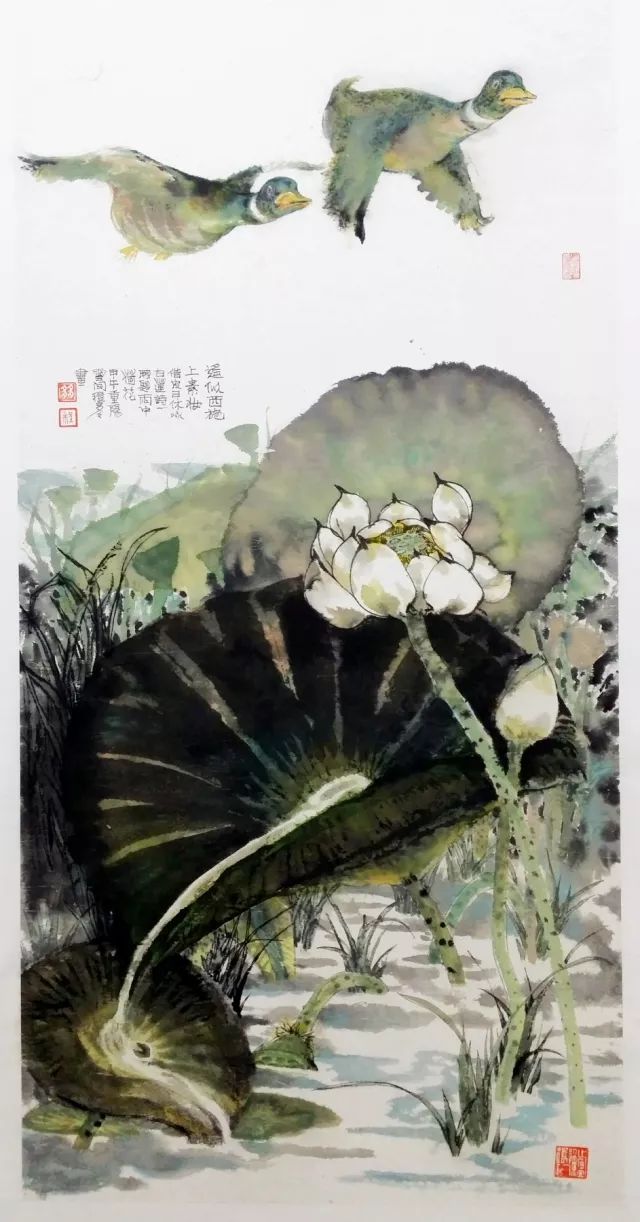 正是这种东张西望,奠定了他今天绘画的一种文化背景和文化眼光。在这种东张西望的“看”的过程中,多多坚定了自己在艺术上东寻西找“画”的决心。他在东方艺术中寻找到了中国画最独有的气质精神,就是绘画灵动的韵致。力图表现出艺术对象的风韵、情韵和气韵。他笔下的花草山水人物,无一不带着一种中国式的生动,一种中国文化独有的流动的气息。他的西找就是找西方艺术中能嫁接融合而不是生硬凑合到中国画中去的艺术元素,尤其是西方画对再现性色彩和空间深度的特殊敏感。东寻西找最容易产生的流弊是东拼西凑。西画色彩的再现性必须能与中国笔墨浑成一样,必须能够溶解到东方的写意学观中。在多多画的那些花鸟画中,我们分明看到水彩画的某些色彩方法,有了某种光影和体量的变化,但在欣赏的过程中,它们又会慢慢呈现出某种平面花的装饰性效果来。妙在它们游移在平面与立体之间。
